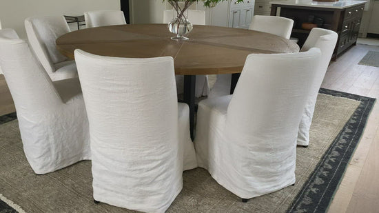The Craig Dining Chair is featured in a gorgeous white linen slip cover in a Belgian wrinkle. The chair is comfortable, chic, and easy to care and maintain.