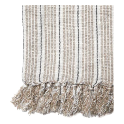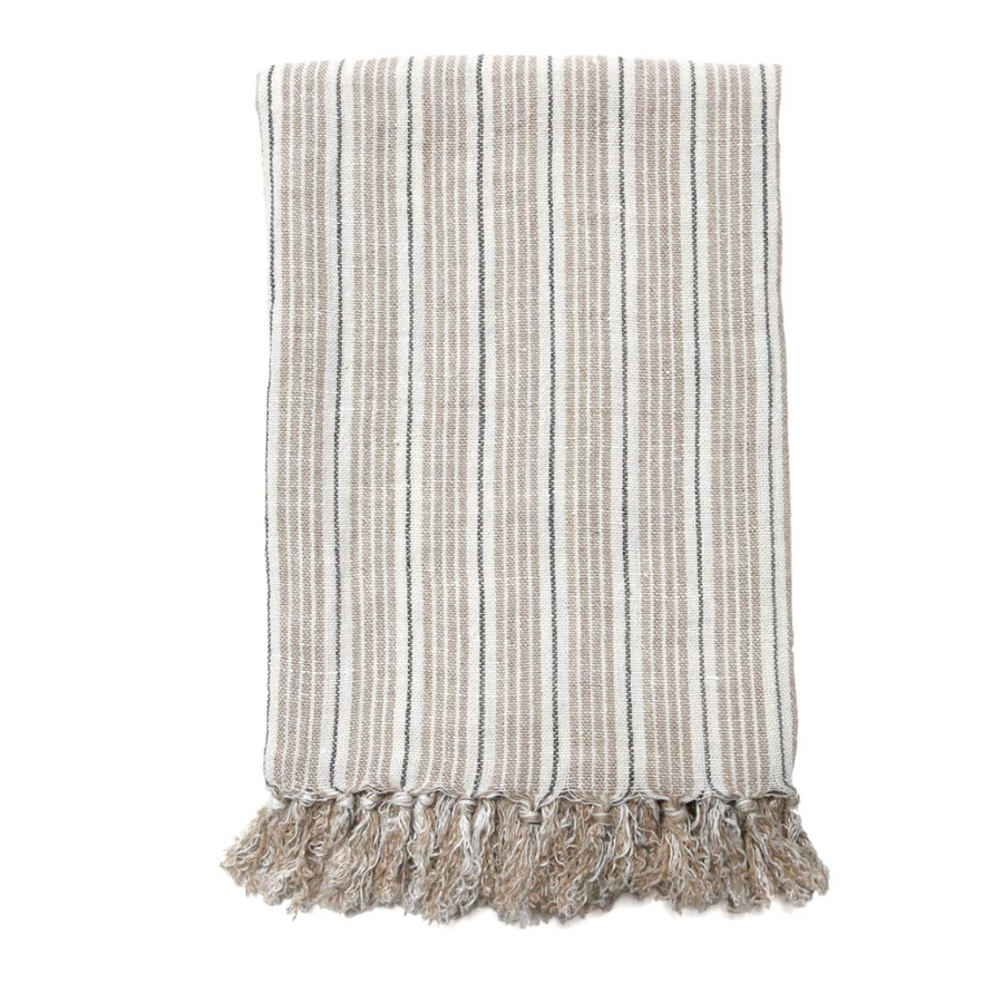The Newport Throw by Pom Pom at Home is a soft, heavy knit linen that is hand-loomed and features a thicker natural stripe alongside a thin midnight stripe with tassels all along the edge.