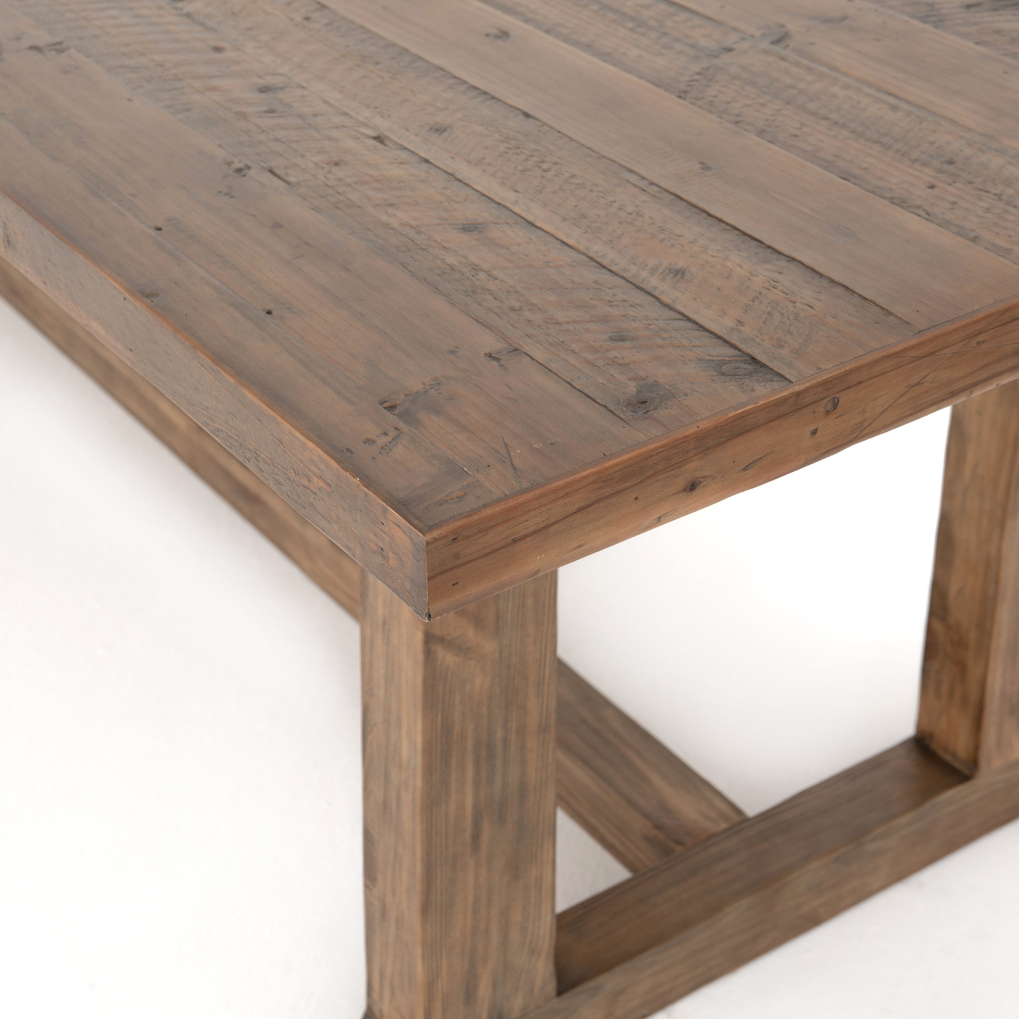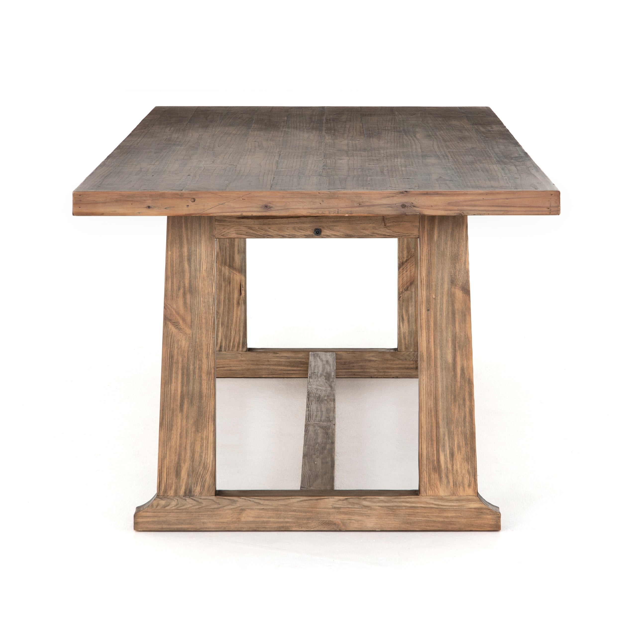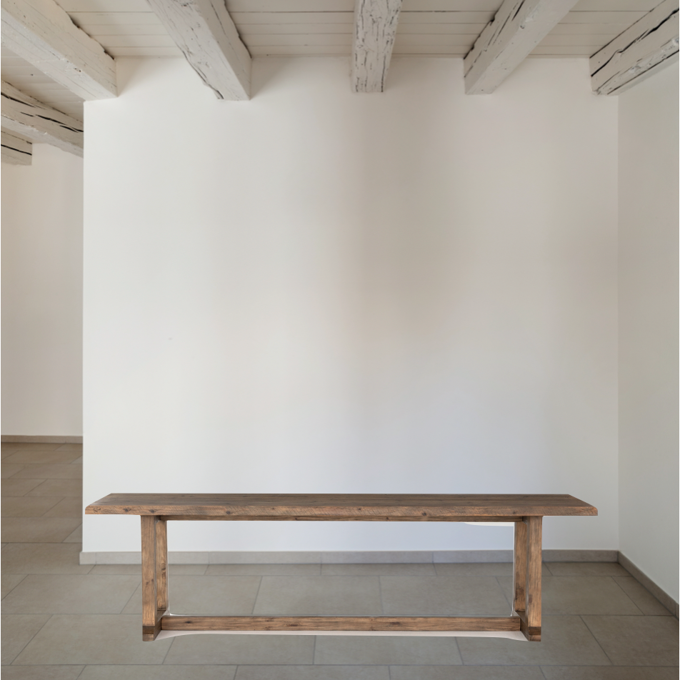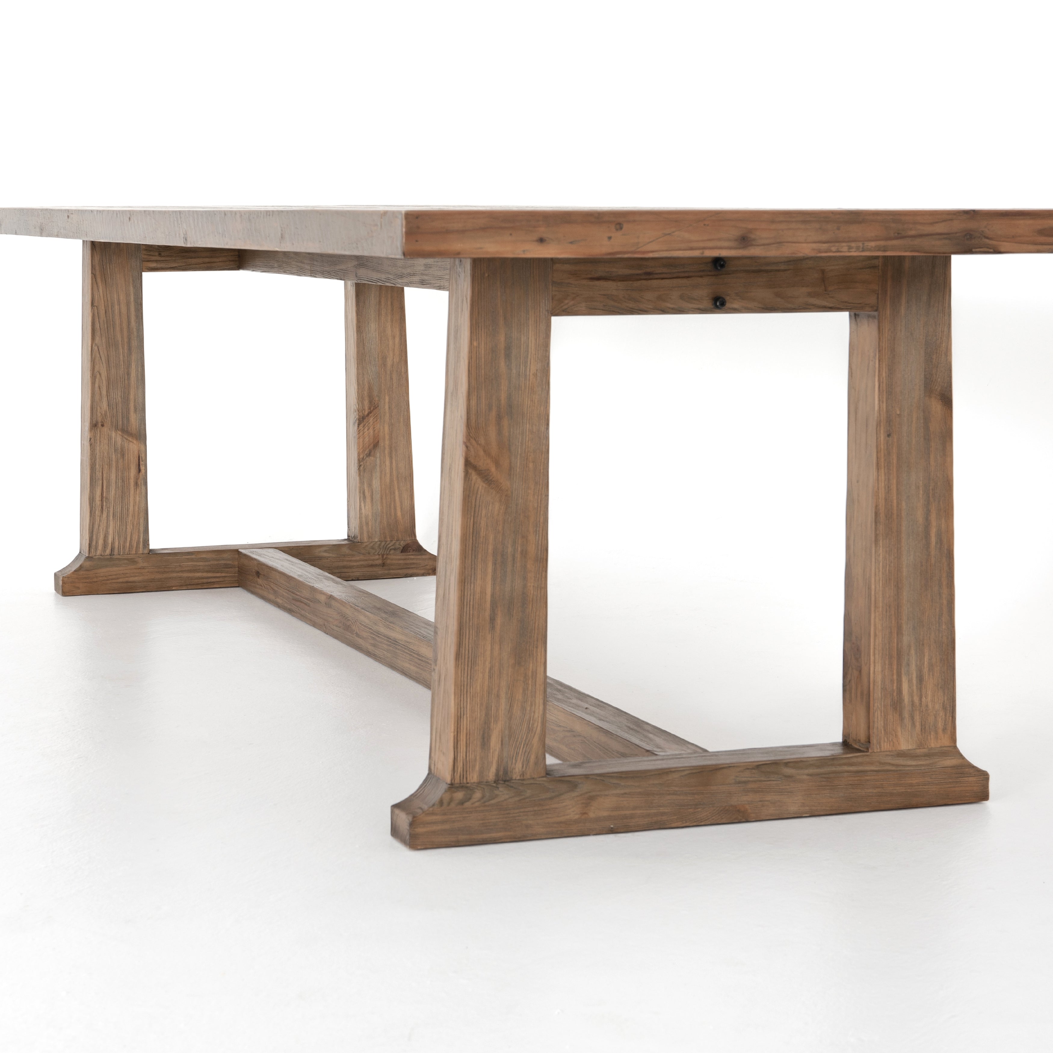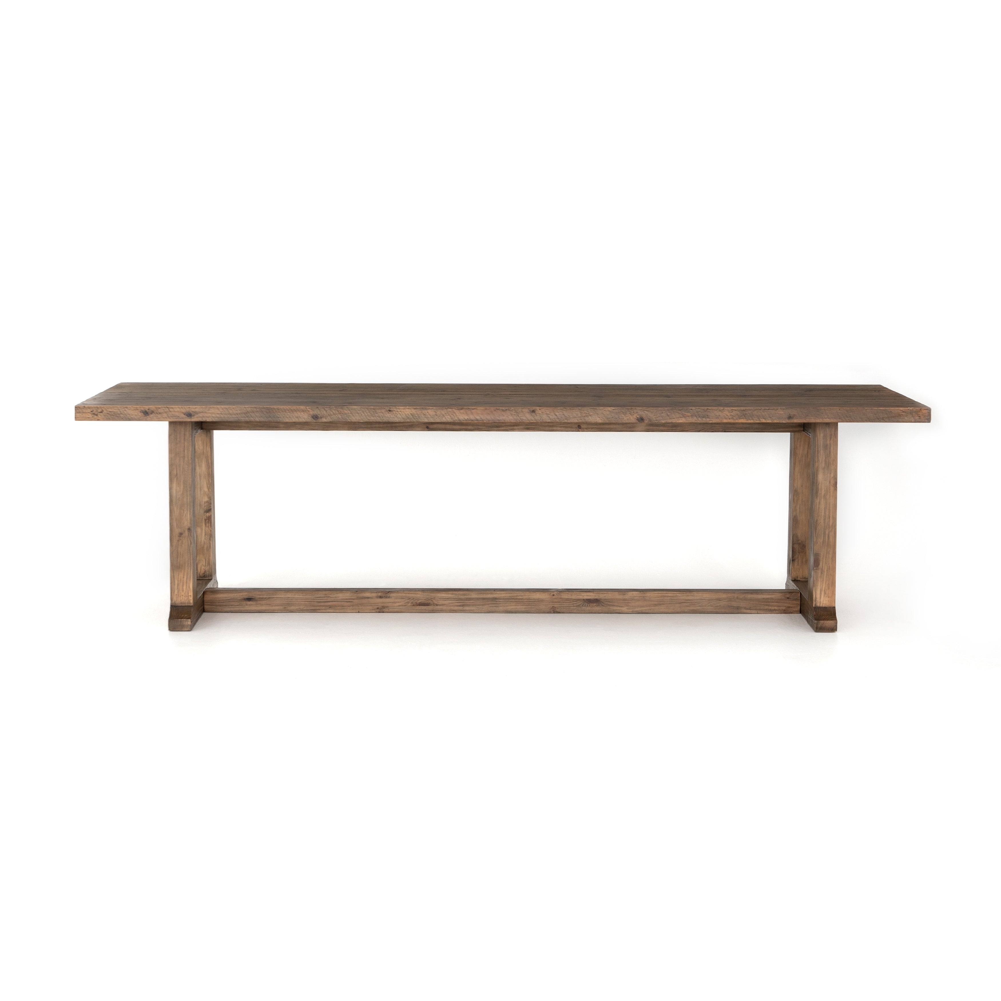 Bring a traditional sense to the table with this Otto Dining Table - 110". Finished in a warm honey hue, a trestle-style base of reclaimed pine supports a rectangular top of pine, waxed and bleached for a rustic look with natural depth.