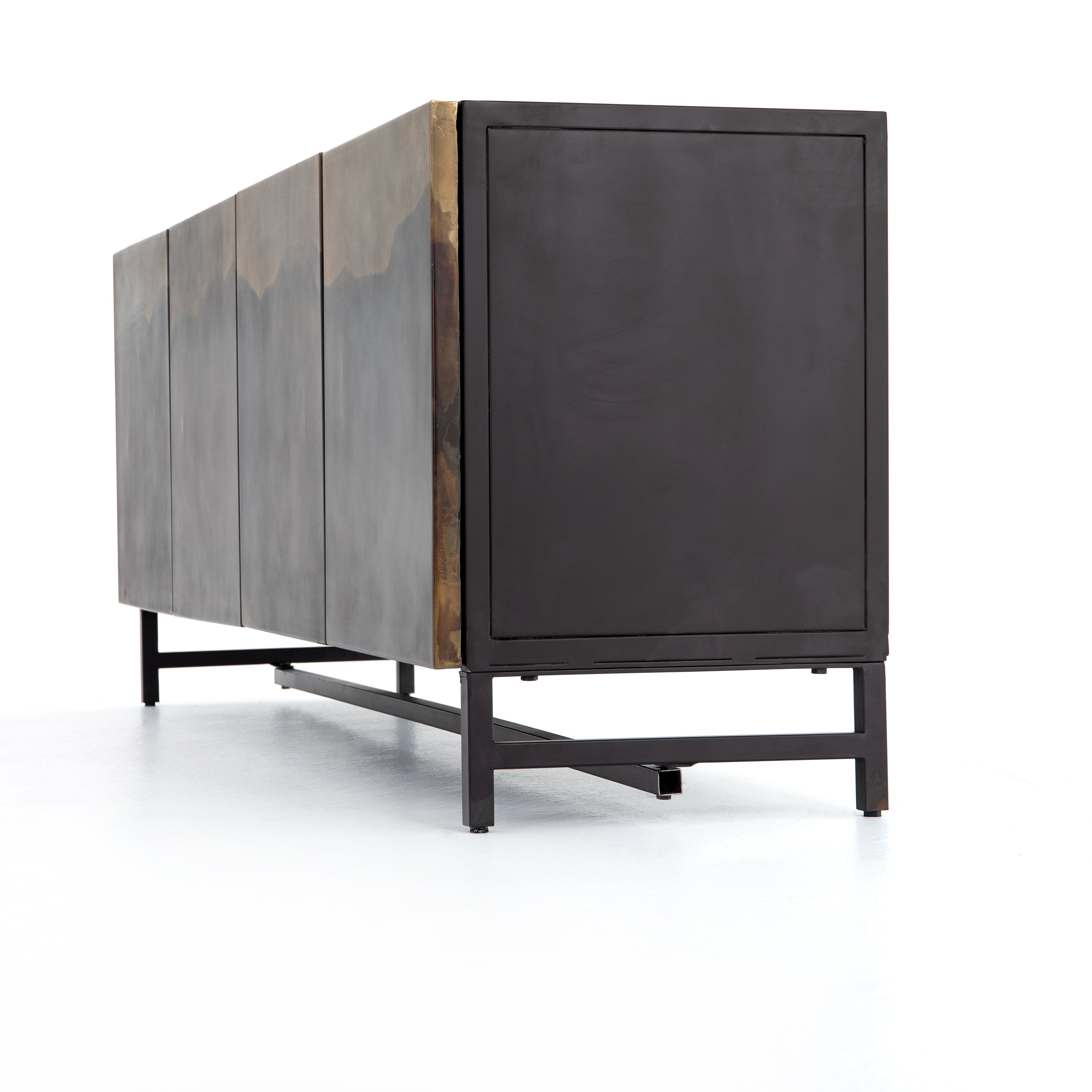 Irons distressed ombre finish emits a feeling of movement that keeps the eye moving. The spacious interior of the Stormy Media Console brings plenty of space to media storage. Oxidation varies from piece to piece, due to organic nature of materials.