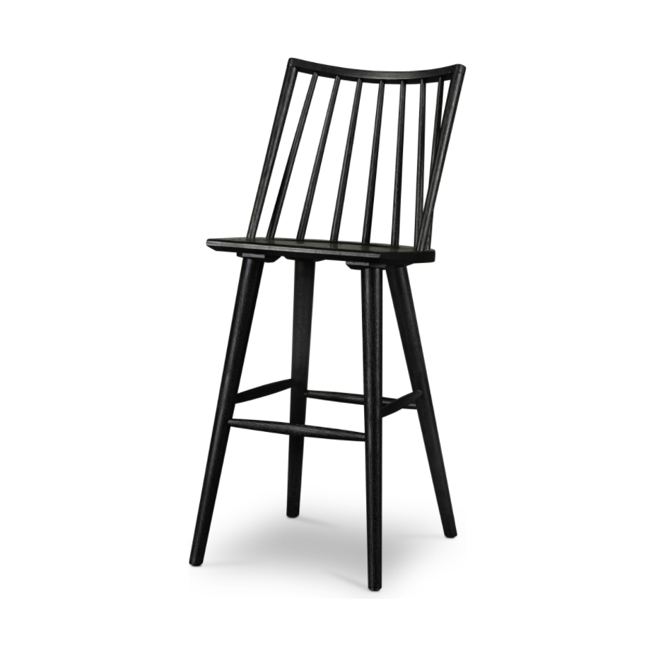 Featuring Lewis Windsor Bar + Counter Stool - Black Oak by Four Hands at Amethyst Home. A clean, modern take on the traditional Windsor. This tall and beautiful Windsor Bar Stool is wire-brushed to highlight the cathedral grain of black oak.