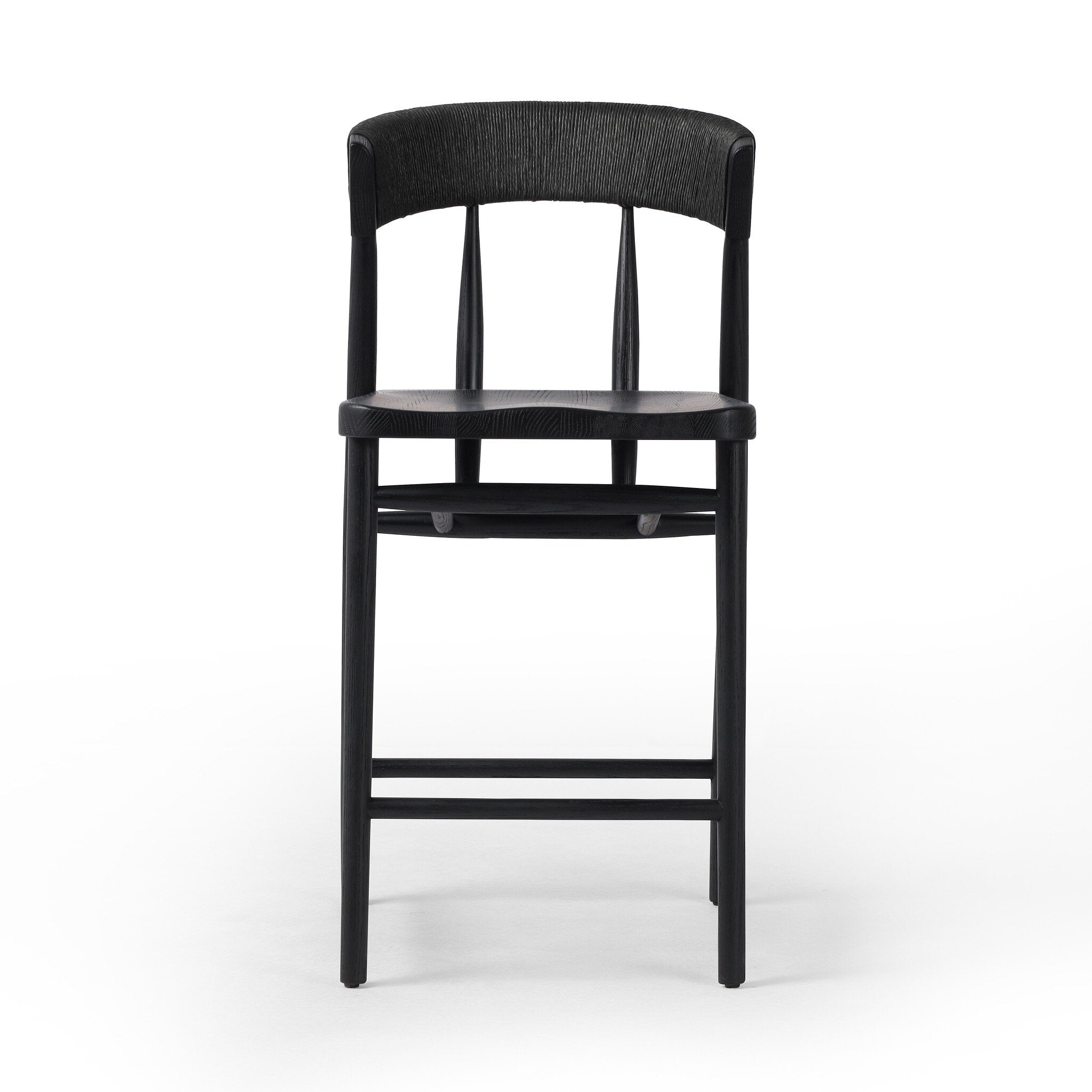 Featuring Buxton Black Rush Bar + Counter Stool by Four Hands at Amethyst Home. A solid oak counter stool defined by tapered legs and framing gives an updated look to the classic whistler chair. Finished with a paper rush wrapped detail on the back.BarOverall Dimensions: 19.25"w x 22.25"d x 42.75"hWeight: 23.70 lbsCounterOverall Dimensions: 19.50"w x 22.25"d x . Amethyst Home provides interior design, new home construction design consulting, vintage area rugs, and lighting in the Omaha metro area.