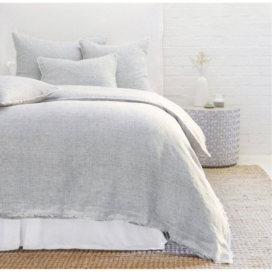 Subtle frayed edges of soft linen add a dash of unexpected detail to this Logan Duvet Collection Navy by Pom Pom at Home. Woven with two different colored yarns for a heathered effect, the duvet cover and shams feature shell button closures.