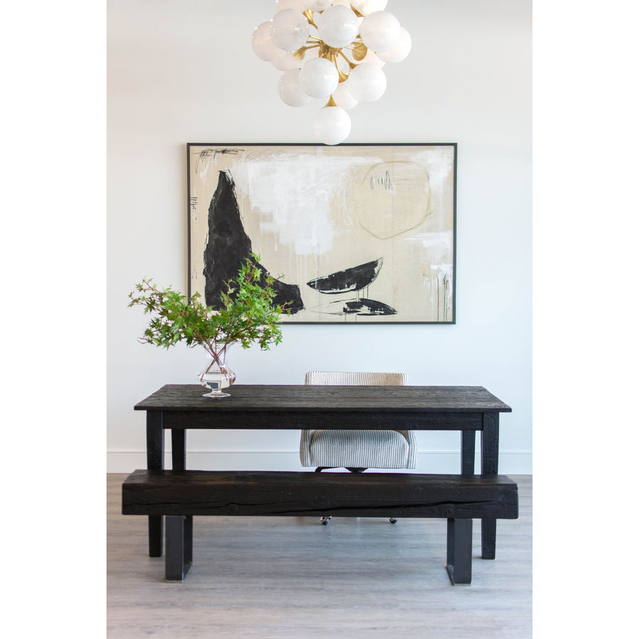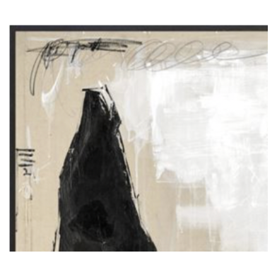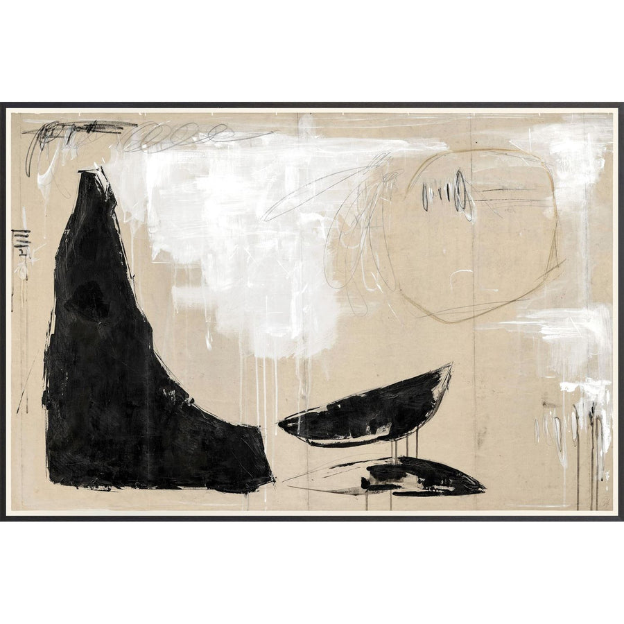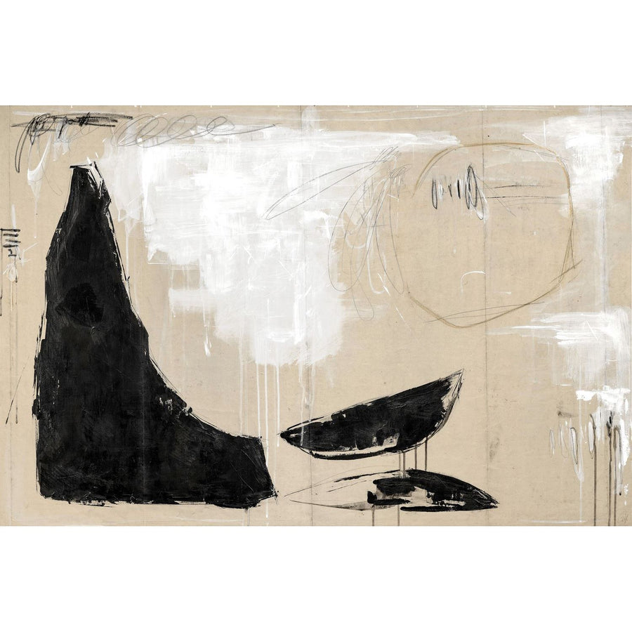 A trebuchet is the French catapult. Here, artist Gayle Harismowich has playfully abstracted this early technology in a mid-century leaning, painterly abstract in mixed media. Bombs away!