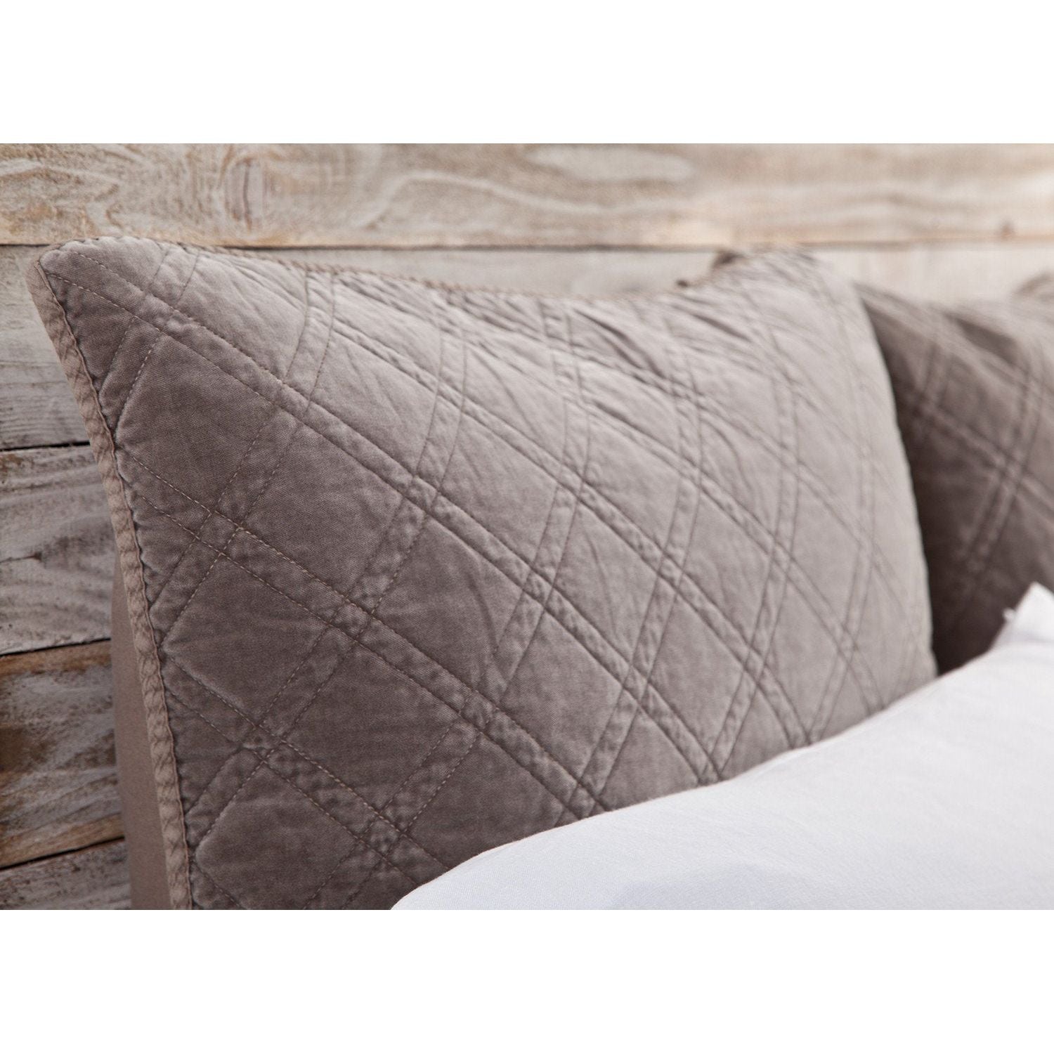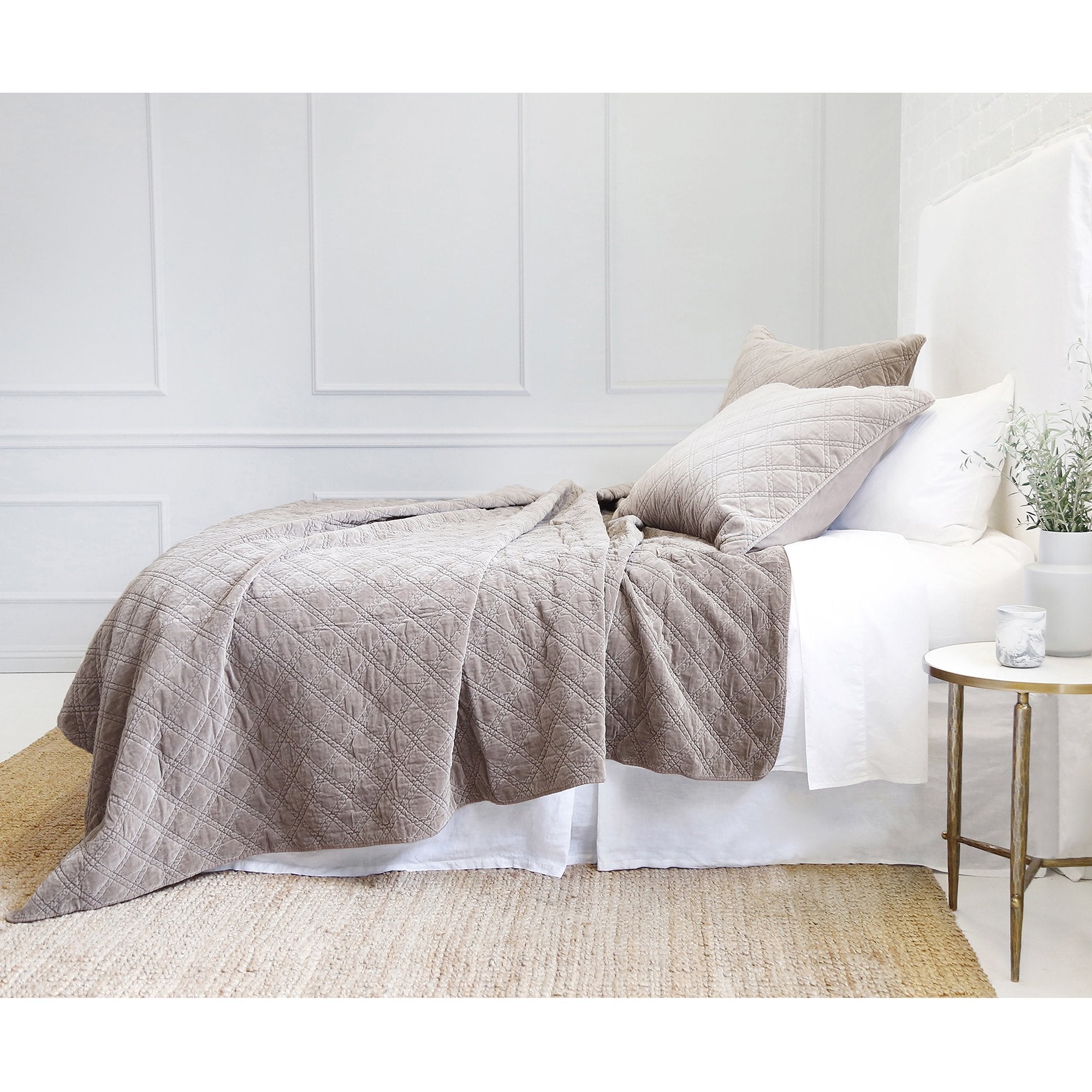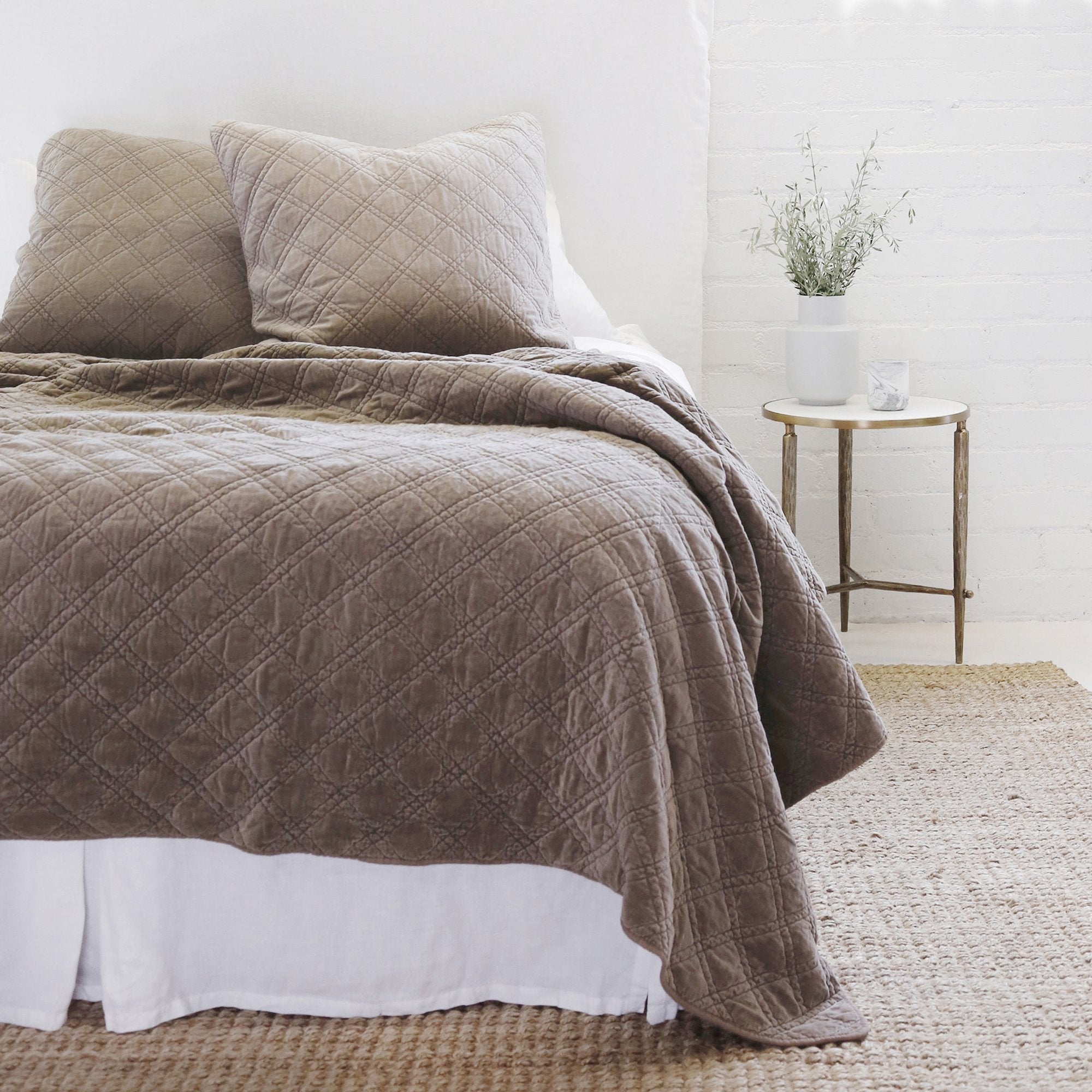 The Brussels Coverlet Bedding Walnut by Pom Pom at Home is a grand and sophisticated line that has a diamond quilted pattern on the front, made of 100% stone washed cotton velvet. Available in several soft, stone washed colors.