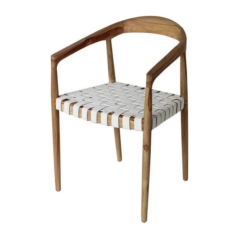 Our Eijnar Dining Chair is crafted from plantation teak wood. The wood has been left unfinished, allowing its raw and unaltered texture to take center stage. The seat of the chair is adorned with a luxurious touch – cow top leather. The leather is white in color, adding a clean and timeless aesthetic to the piece. The leather is woven into a 1x1 webbing pattern, which creates a visually appealing surface and adds texture to the seat.