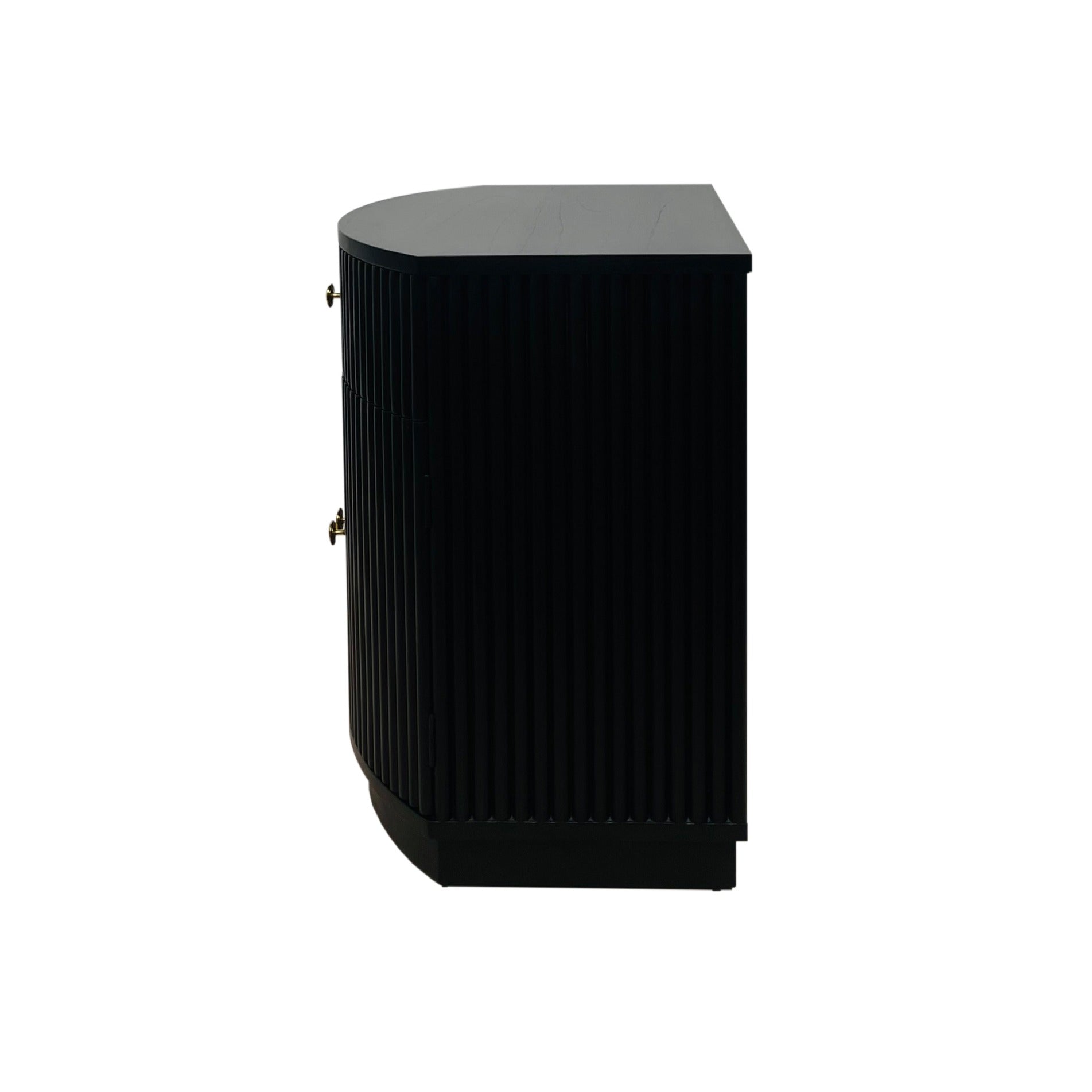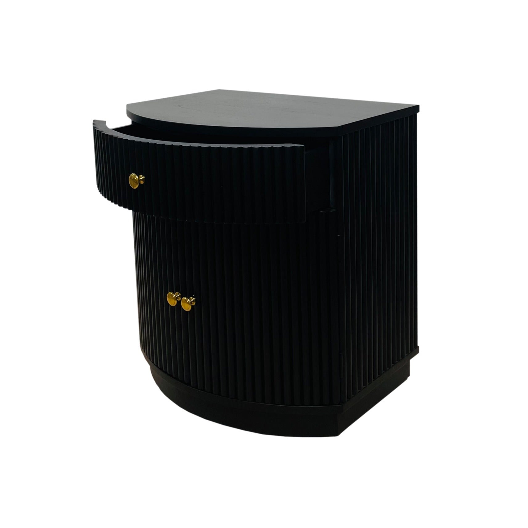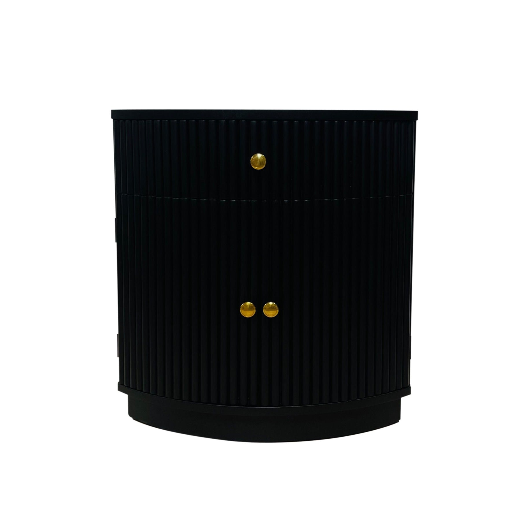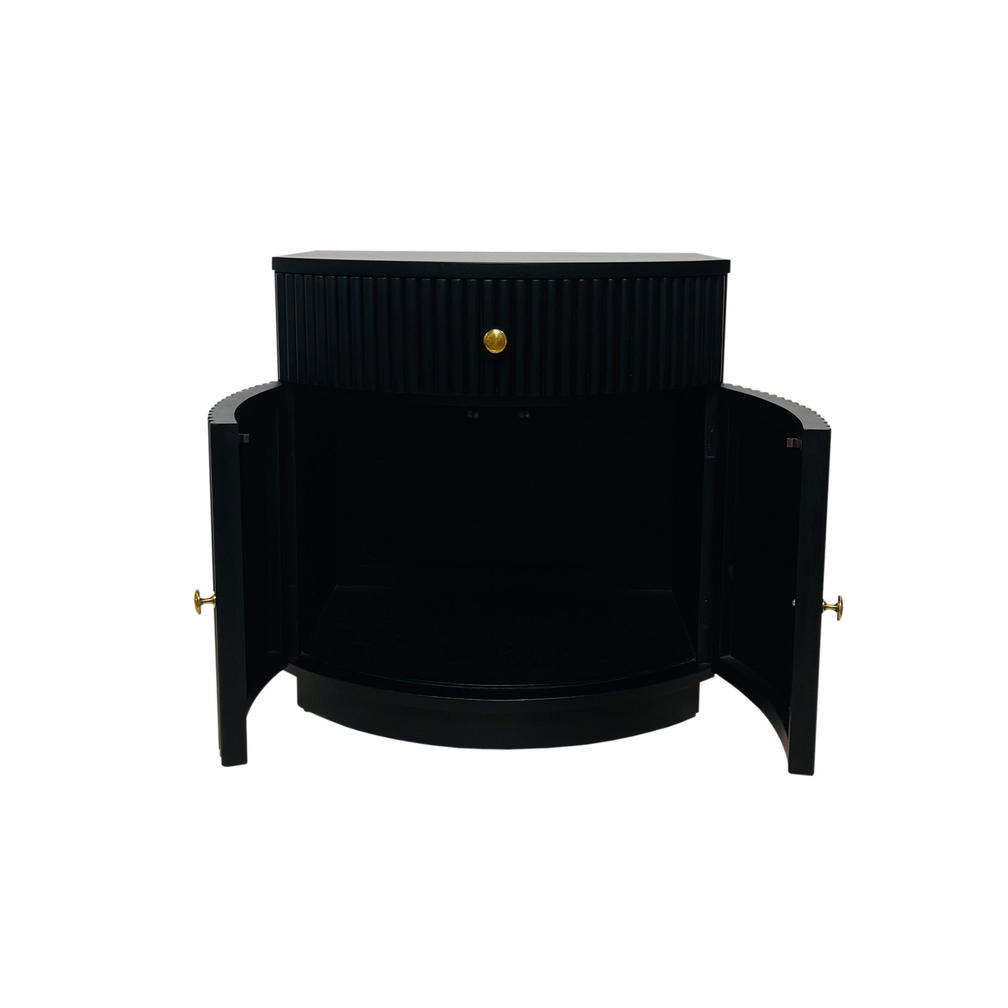 The Elle Side Table table features one drawer with a set of doors. Finished in an open grain black satin finish and aged bronze hardware. Made from sustainable Bayur wood and engineered Mindi wood.