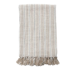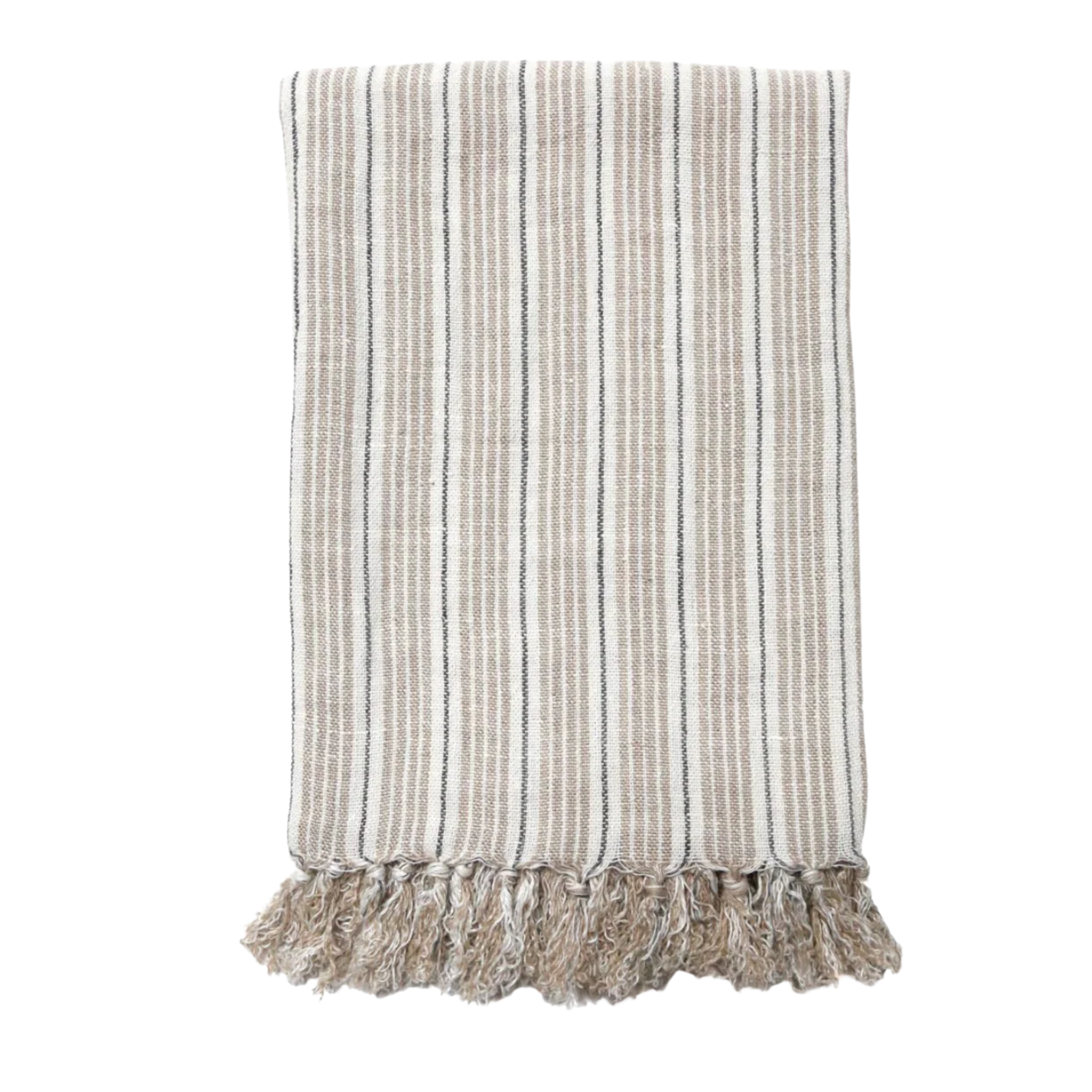The Newport Throw by Pom Pom at Home is a soft, heavy knit linen that is hand-loomed and features a thicker natural stripe alongside a thin midnight stripe with tassels all along the edge.