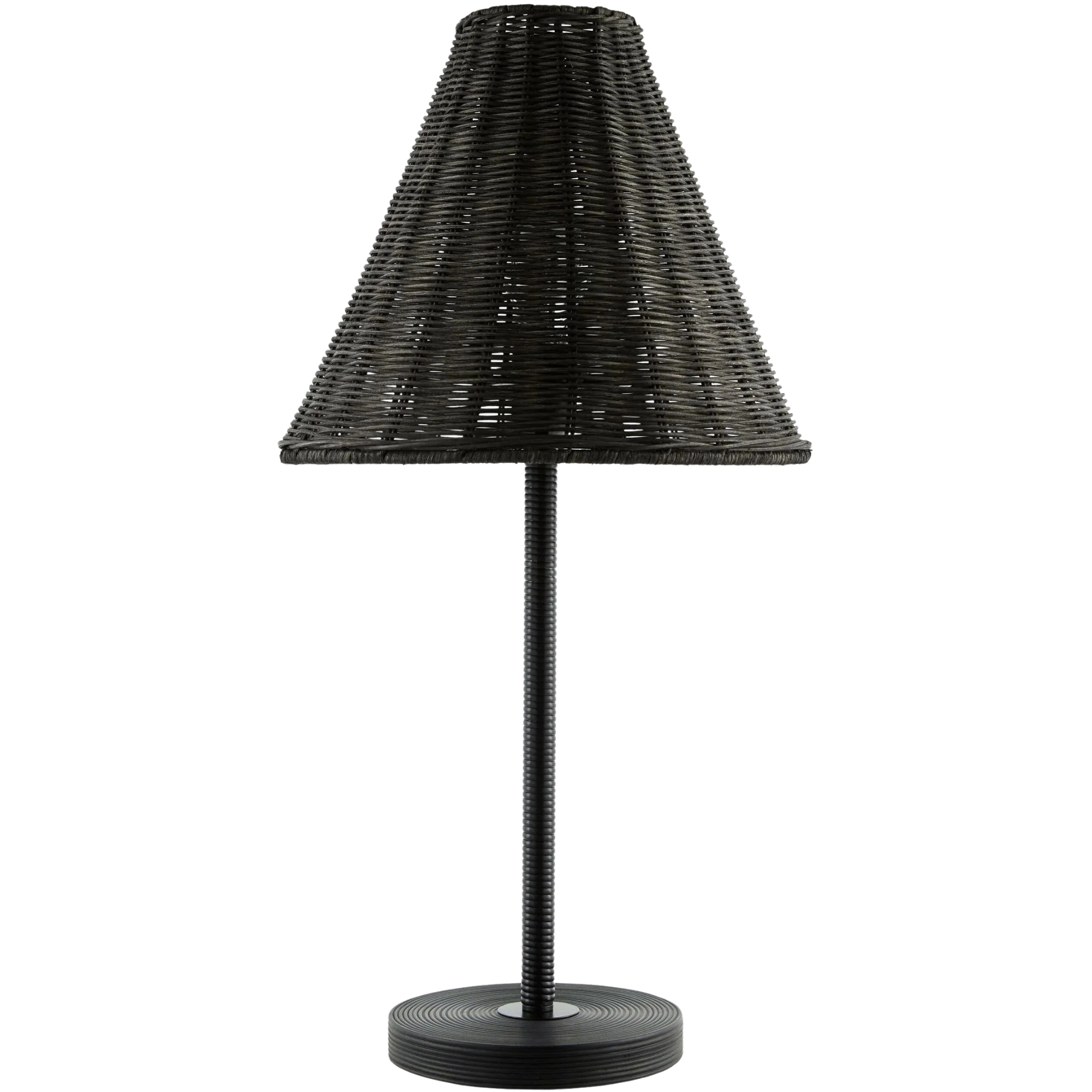 Featuring Safe Accent Table Lamp by Surya at Amethyst Home. Introducing the Safe Accent Table Lamp, a minimalist modern masterpiece that blends functionality and artistry. This lamp stands 25 inches tall, sculpted from iron for the body and a sturdy resin base, giving it a robust yet sleek profile. The shade is made of natural rattan, adding an organic tou.  Amethyst Home provides interior design, new home construction design consulting, vintage area rugs, and lighting in the Calabasas metro area.