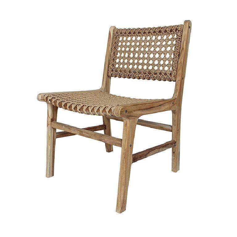 Our Terra Dining Chair is crafted from plantation teak wood wood, the chair's frame showcases the natural beauty of the wood's grain while maintaining a sleek and sophisticated appearance. The seat is covered in a poly hyacinth with creative pattern webbing, making it a unique stylish piece of furniture. The piece is suitable for outdoor use.
