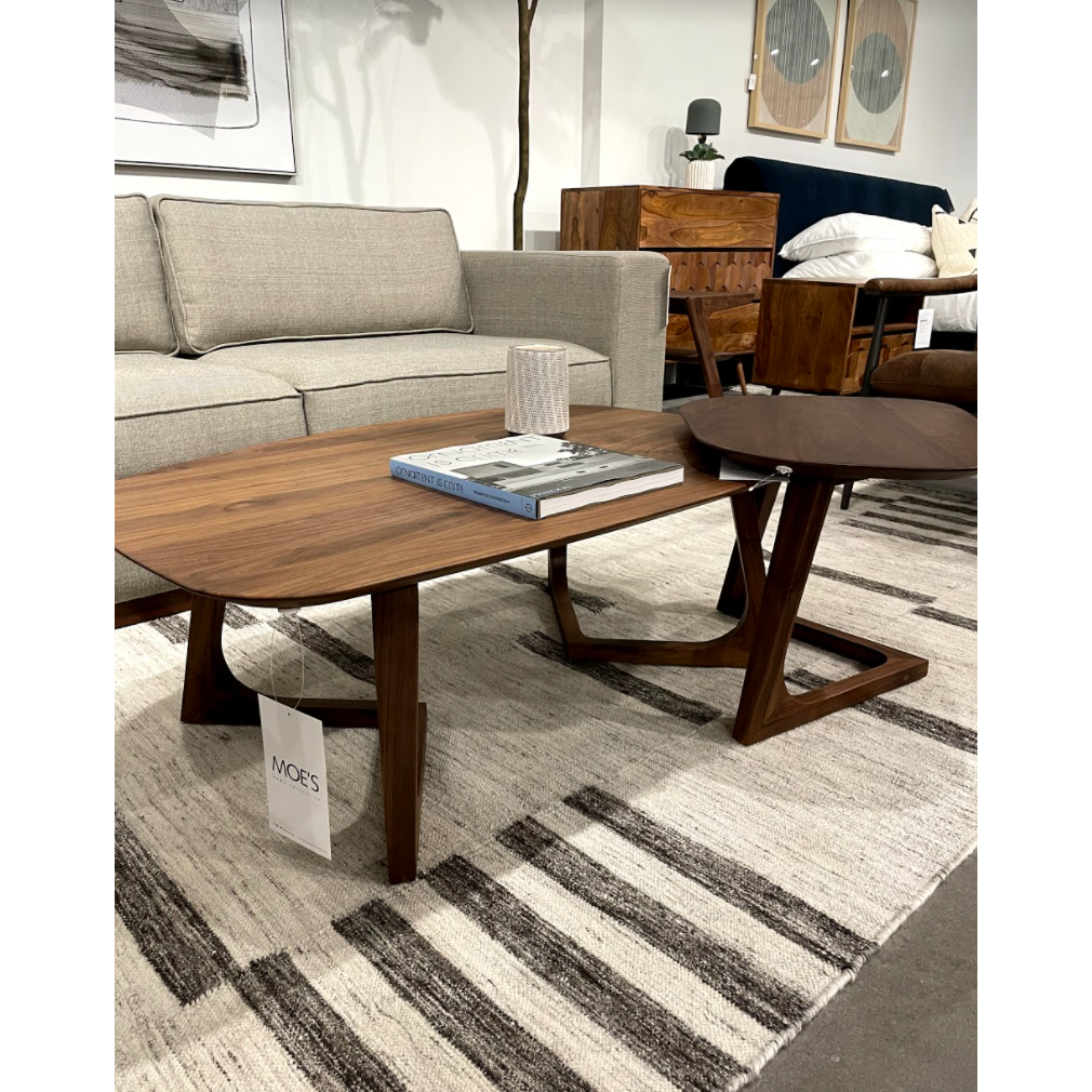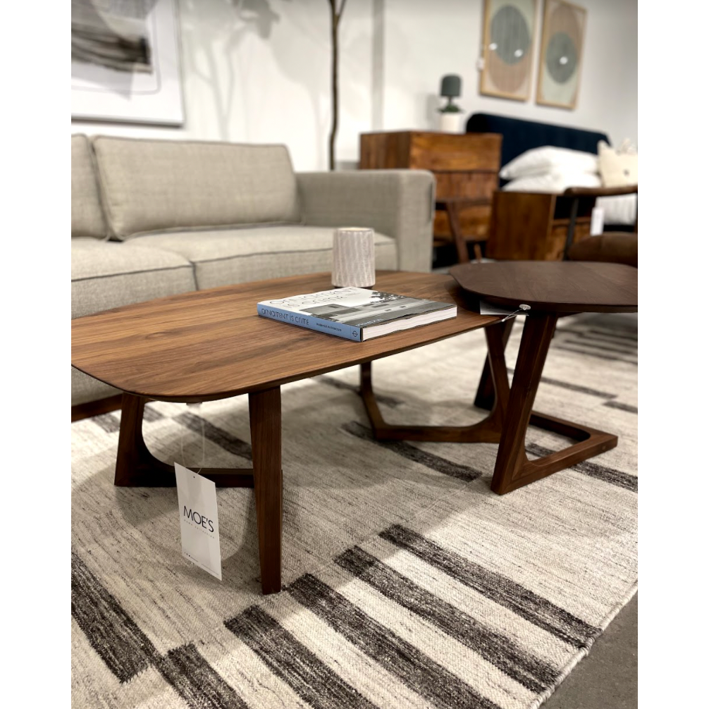 With a solid walnut finish and unique shape, this Godenza Coffee Table is a contemporary take on a mid-century modern classic. Made from solid, high-quality American walnut, this coffee table's warm hues brighten up your space while offering a medium-sized tabletop for your everyday needs.  Size: 42"W x 27.5"D x 15"H