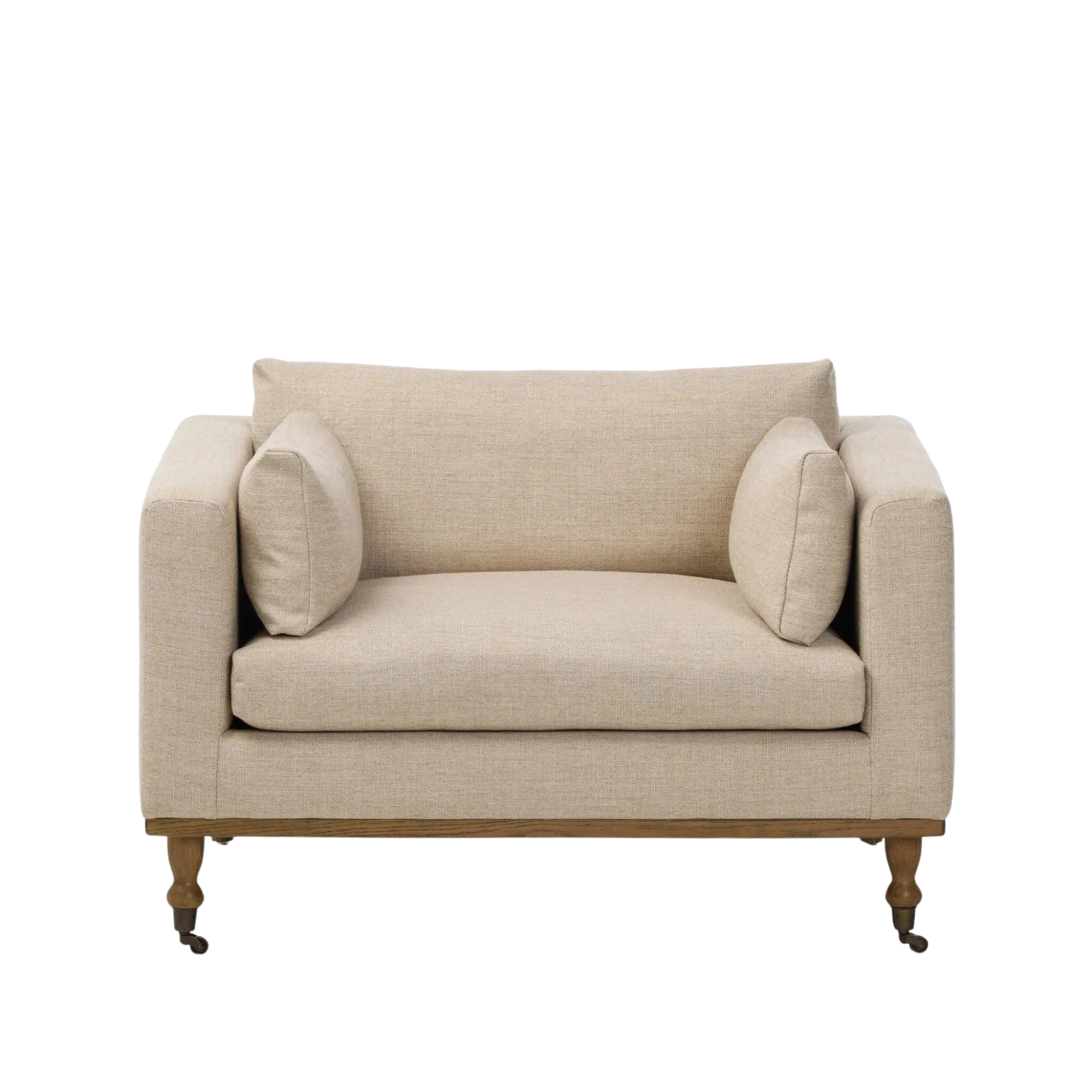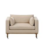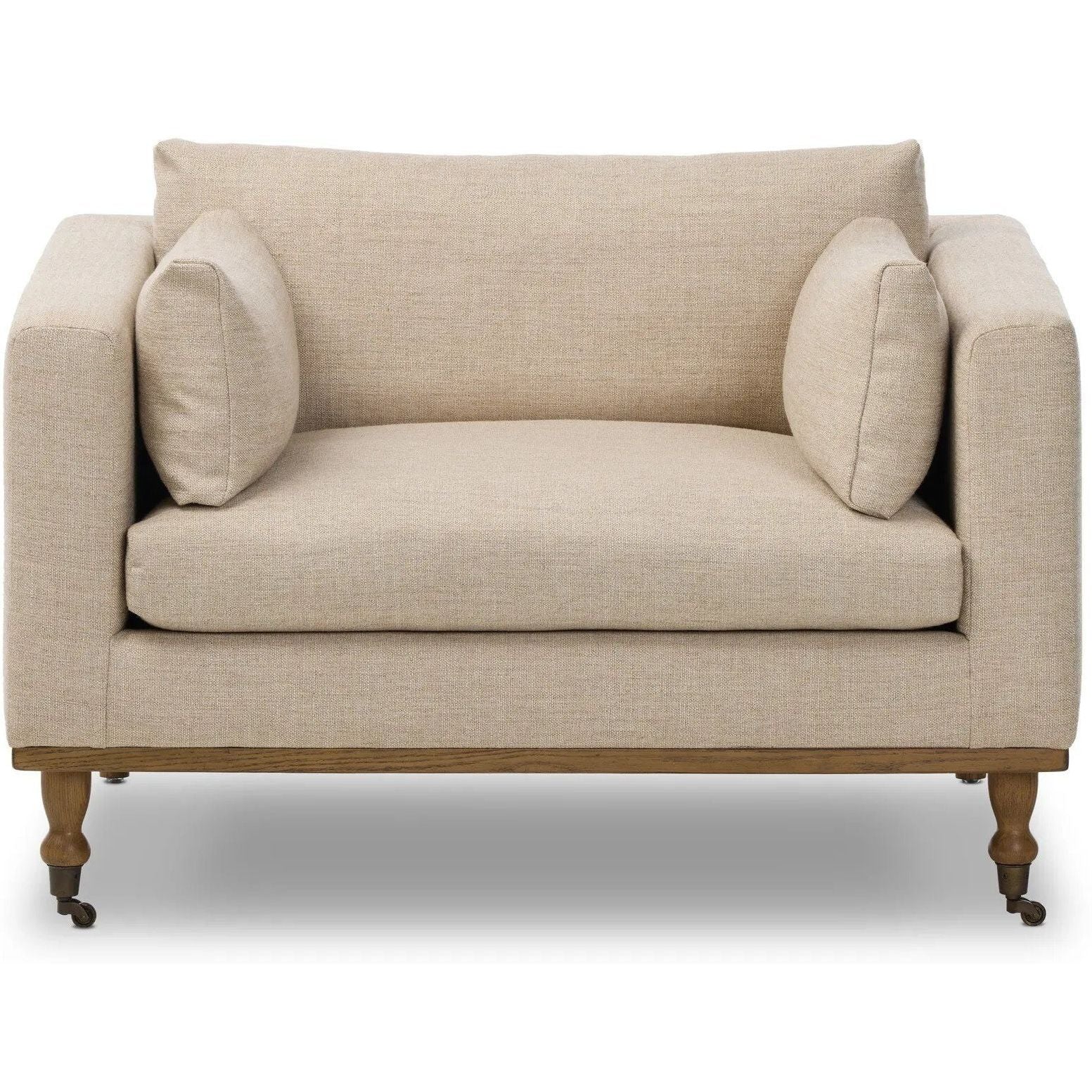 With traditional details like turned oak legs and brass casters, this low-profile accent chair features an elongated bench seat for an inviting sit. Performance fabric in neutral wheat finishes a knife-edge back and boxed arm cushions.