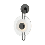 The earring-like design of Keuka Park exudes ornamental, graphic appeal. A thick disc of Blonchino Piastre glass is illuminated at the point where it attaches to the racetrack frame of this striking wall fixture. Whether finished in Aged Brass or Old Bronze, Keuka Park brings modernist artistry to any wall.