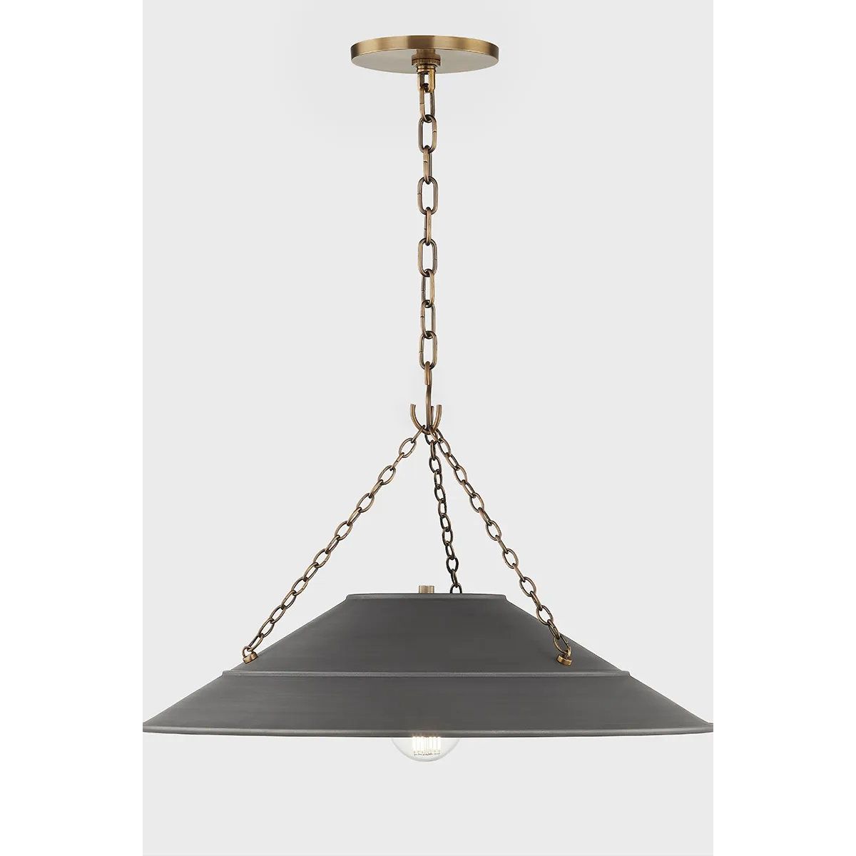 With its exposed metalwork, chain detailing, and unique finish combination, Arcane has an elevated, industrial vibe. The graphite shade feels chic and gives off a warm glow. The Patina Brass hardware, chain, and canopy add a hint of shine that plays wonderfully off the graphite. The twisted black fabric cord is a subtle detail that gives the pendant a vintage feel. Part of our Lauren Liess collection.