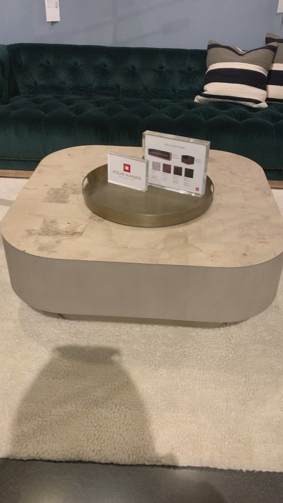 Featuring Blanco Coffee Table - Bleached Burl by Four Hands at Amethyst Home. Made from bleached ash burl, this Blanco Coffee Table - Bleached Burl is a soft-squared tabletop featuring a patchwork pattern to bring novel movement to the modern coffee table. Finished in an ashen walnut, mahogany veneer sides and an inset base complete a beautifully light loo.  Amethyst Home provides interior design, new home construction design consulting, vintage area rugs, and lighting in the Nashville metro area.