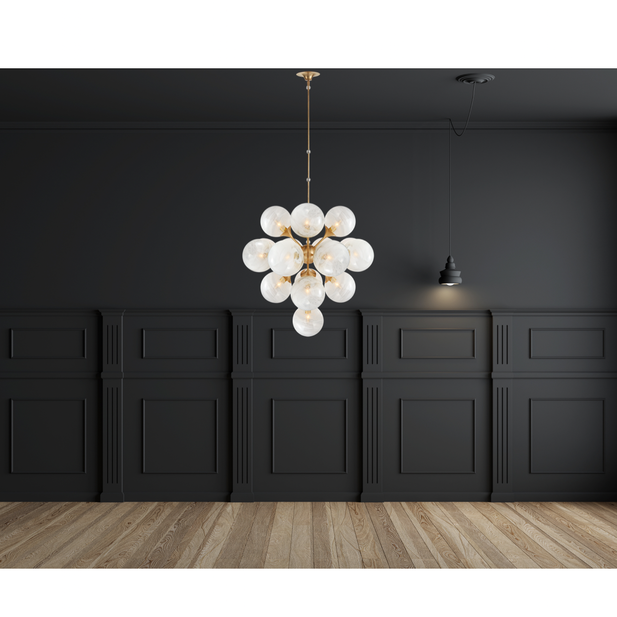 We love the white strie glass globes on this Cristol Large Chandelier by Visual Comfort. It brings a stunning and unique look to any living room, dining room, or kitchen.