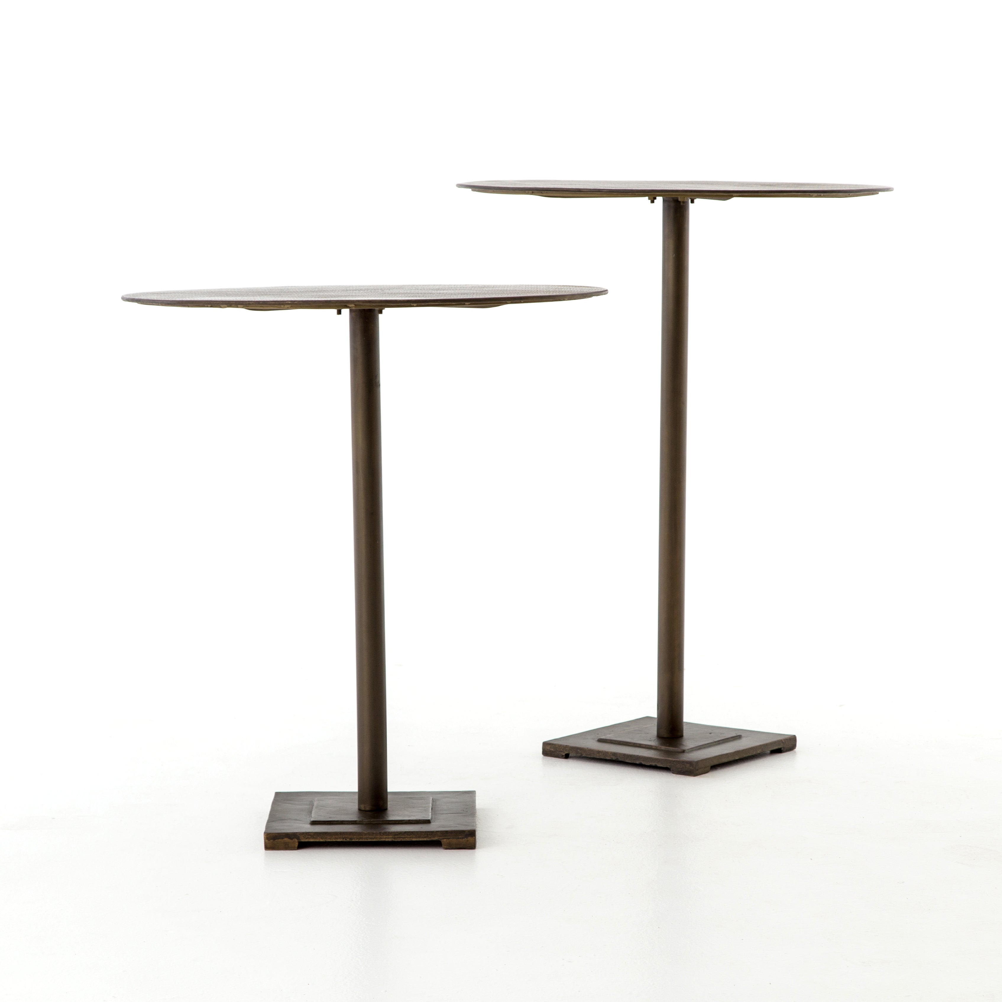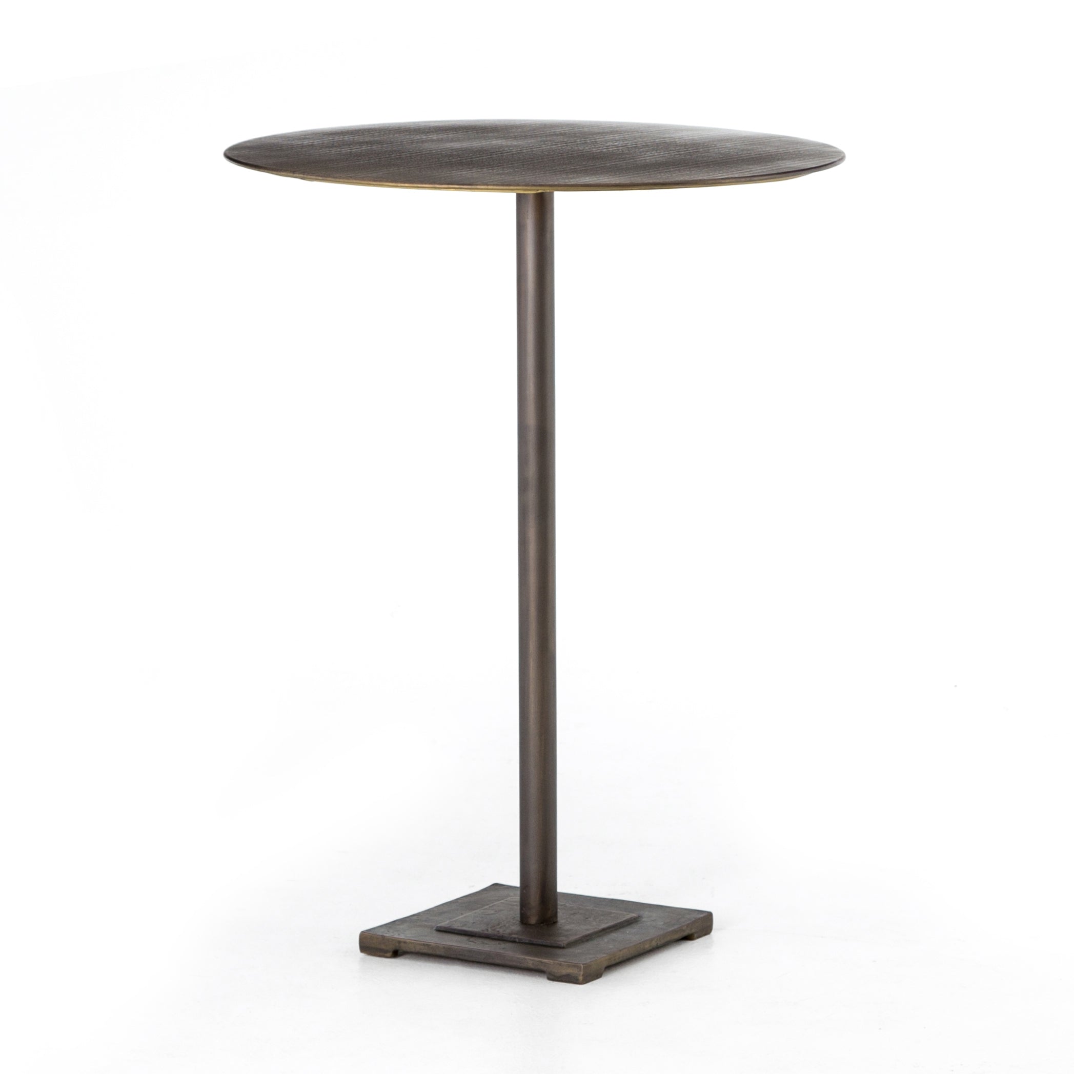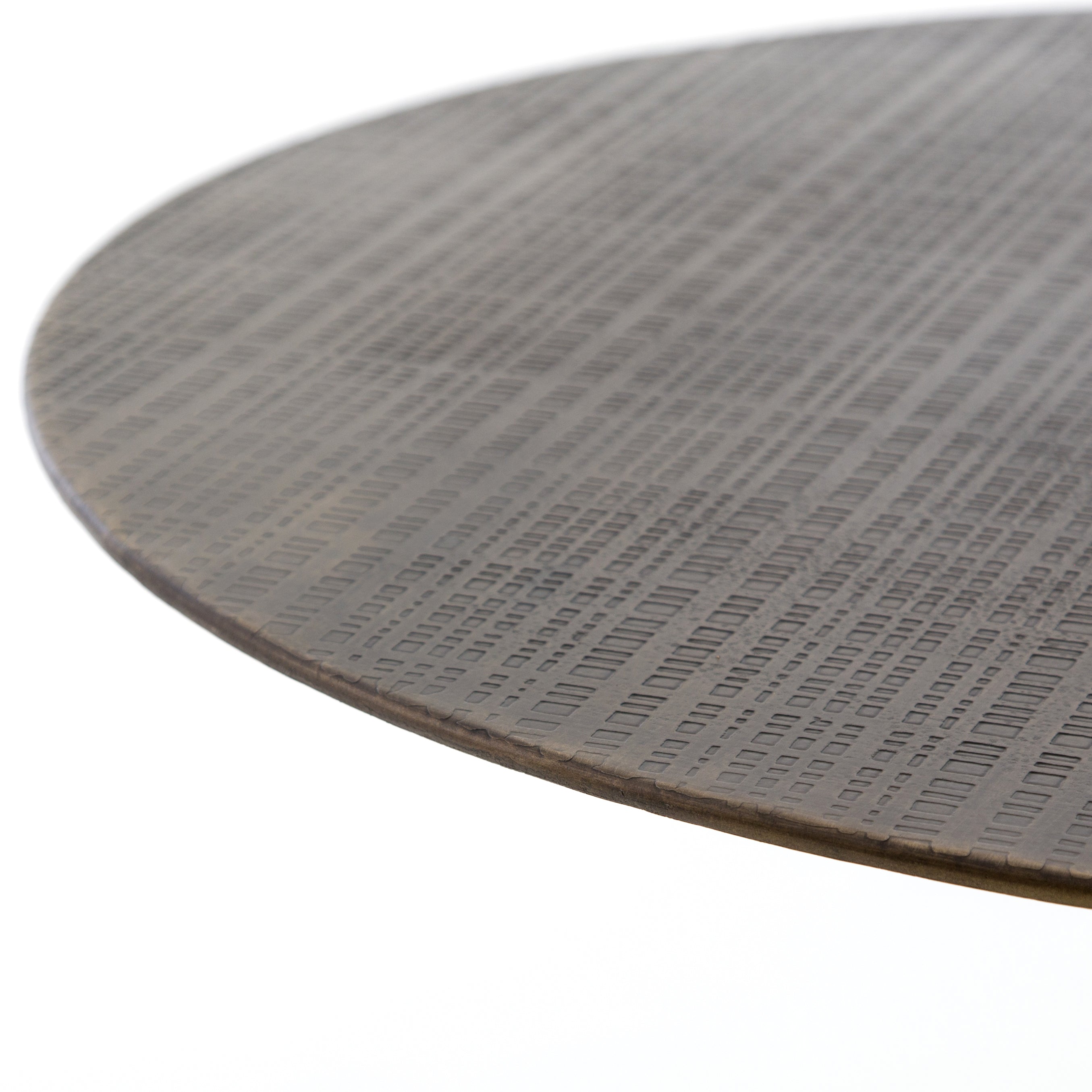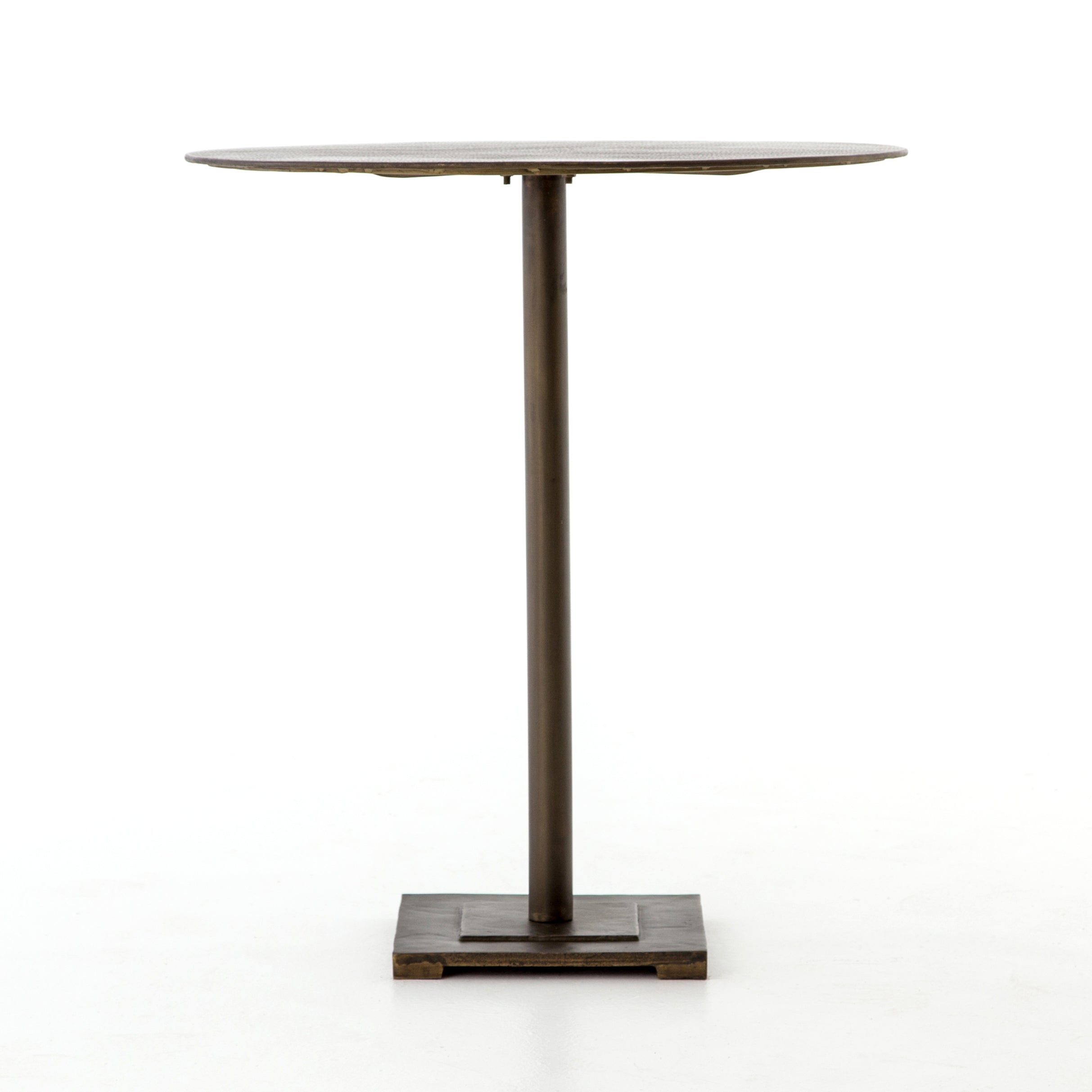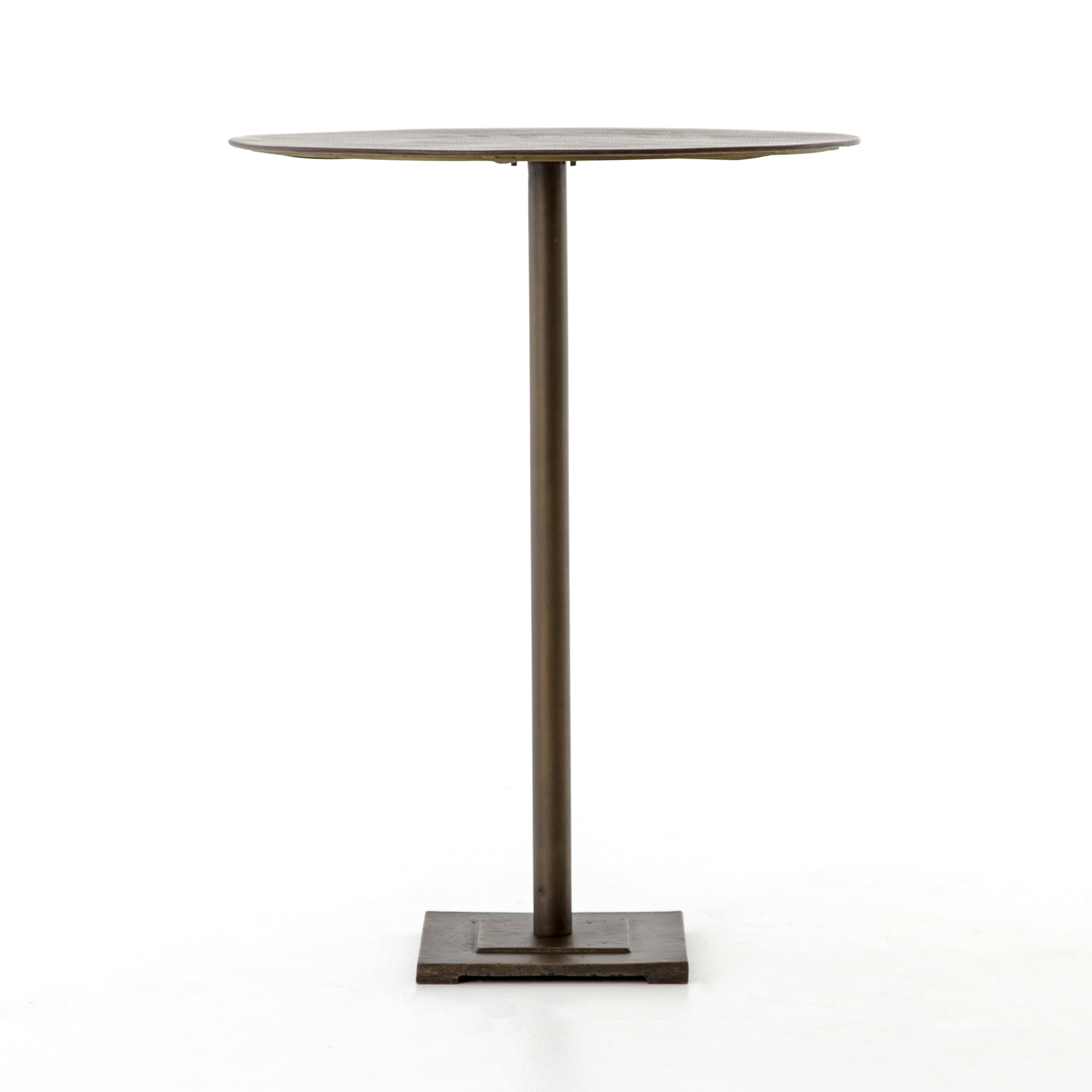 We love the antique brass finish of this Fannin Bar + Counter Table. The acid-etched top pattern sets an industrial pace for this pedestal-style bistro table, perfect for any lounge or bar area.