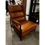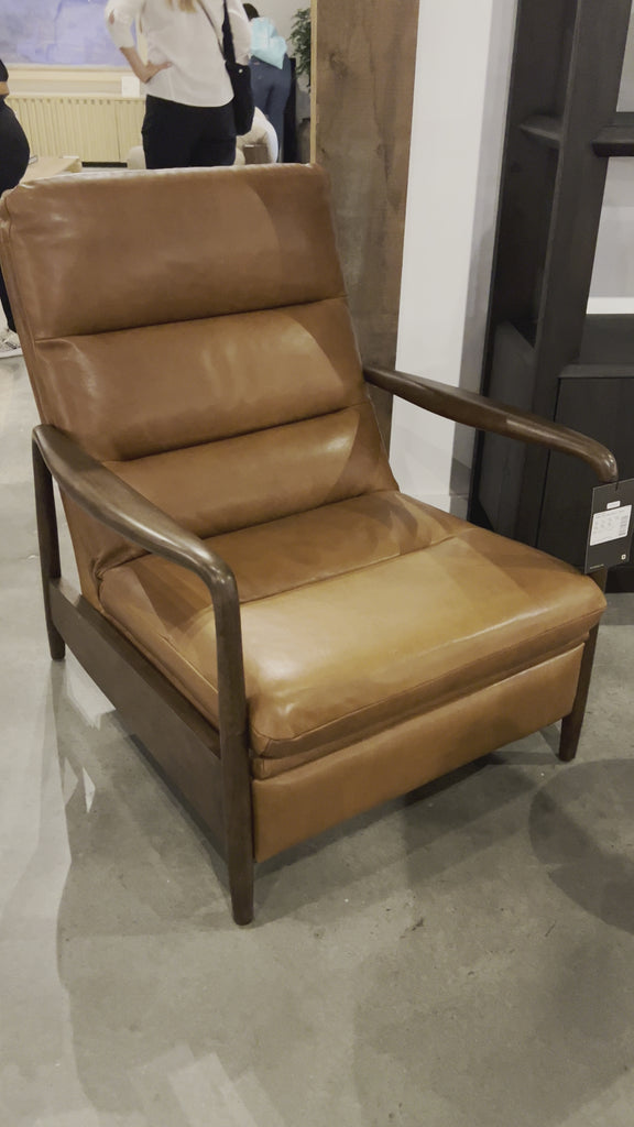 A sleek seat with hidden push-back reclining functionality. This midcentury-inspired recliner features wide chunky channeling paired with slim paddle arms and a tapered wood frame. Designed with a high seat and high back for extra comfy support. Upholstered in a timeless tobacco-hued leather made in a family-owned tannery in Thailand.