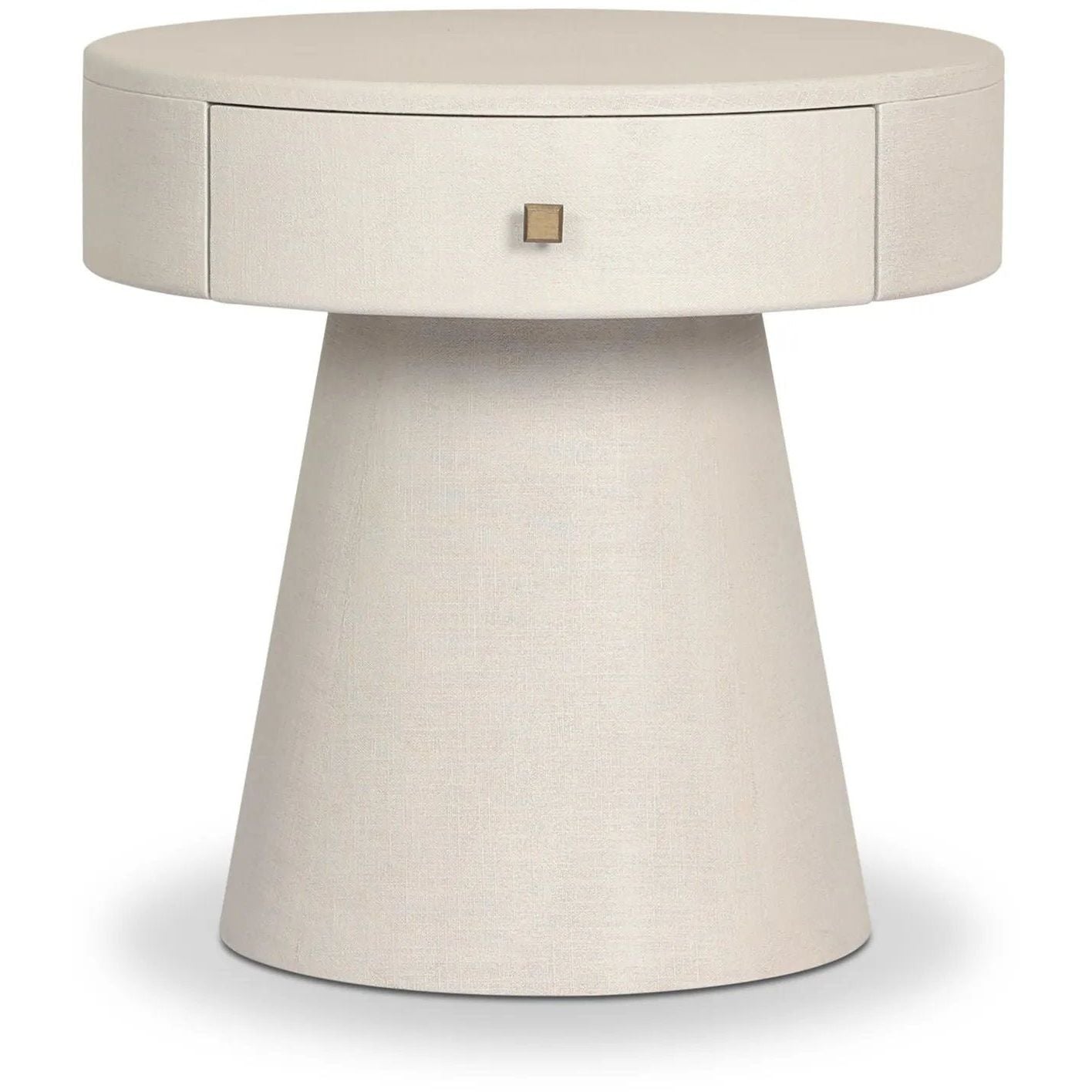 Wrapped in ivory painted linen, a rounded nightstand features a single drawer and tapered pedestal base, bringing crisp texture plus storage to the bedside.