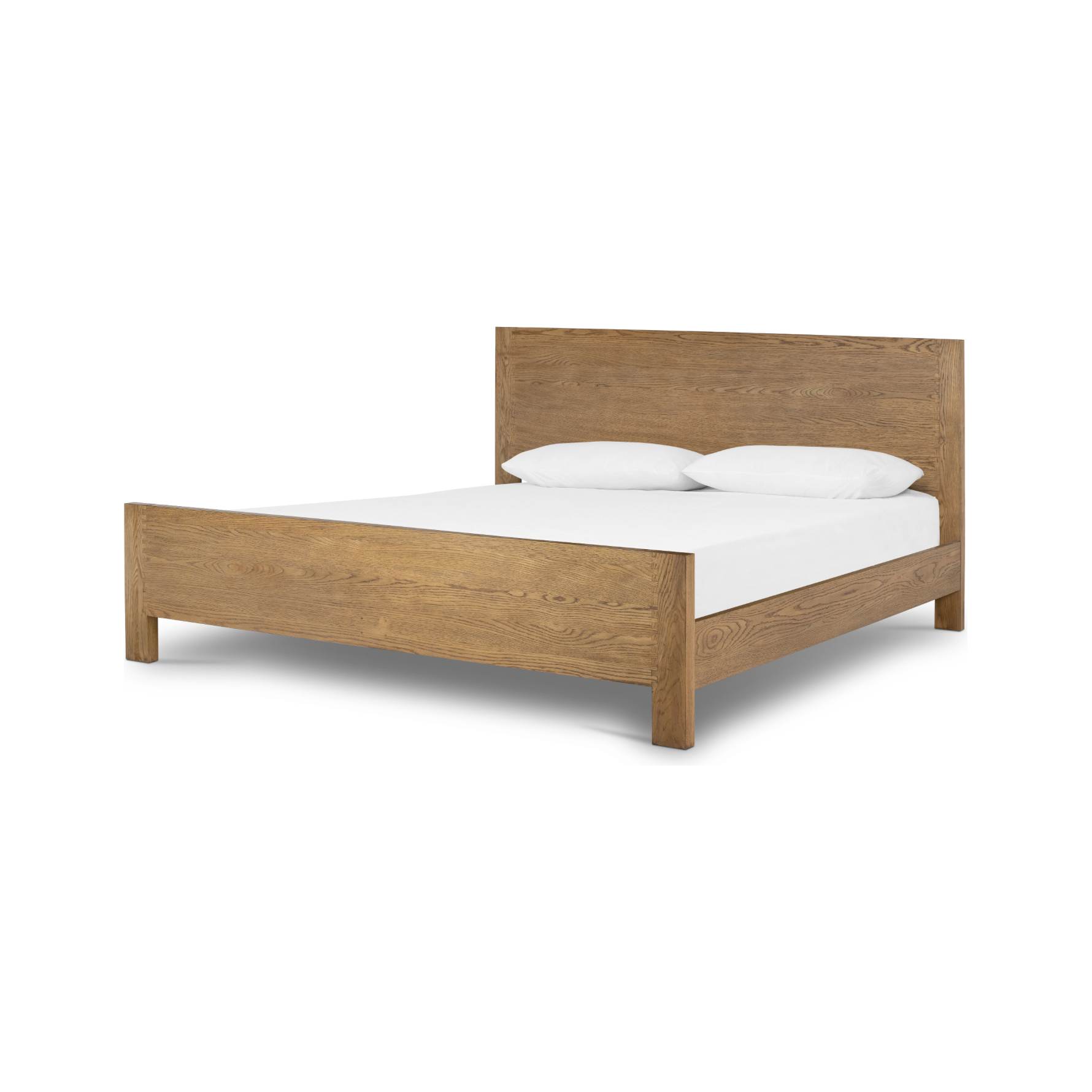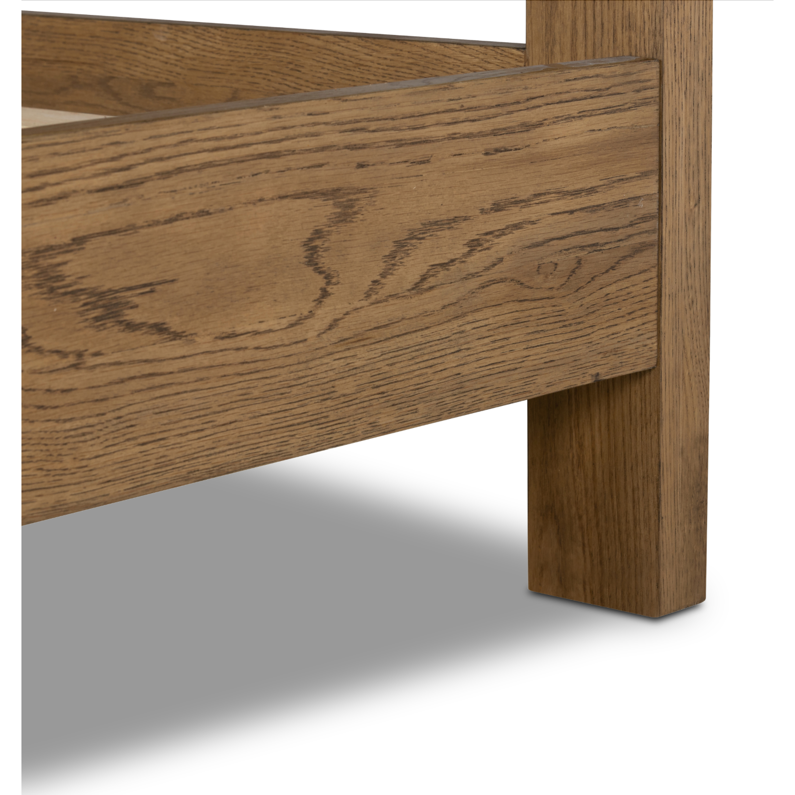 A simply shaped bed of warm-finished oak offers a handcrafted look inspired by midcentury design.