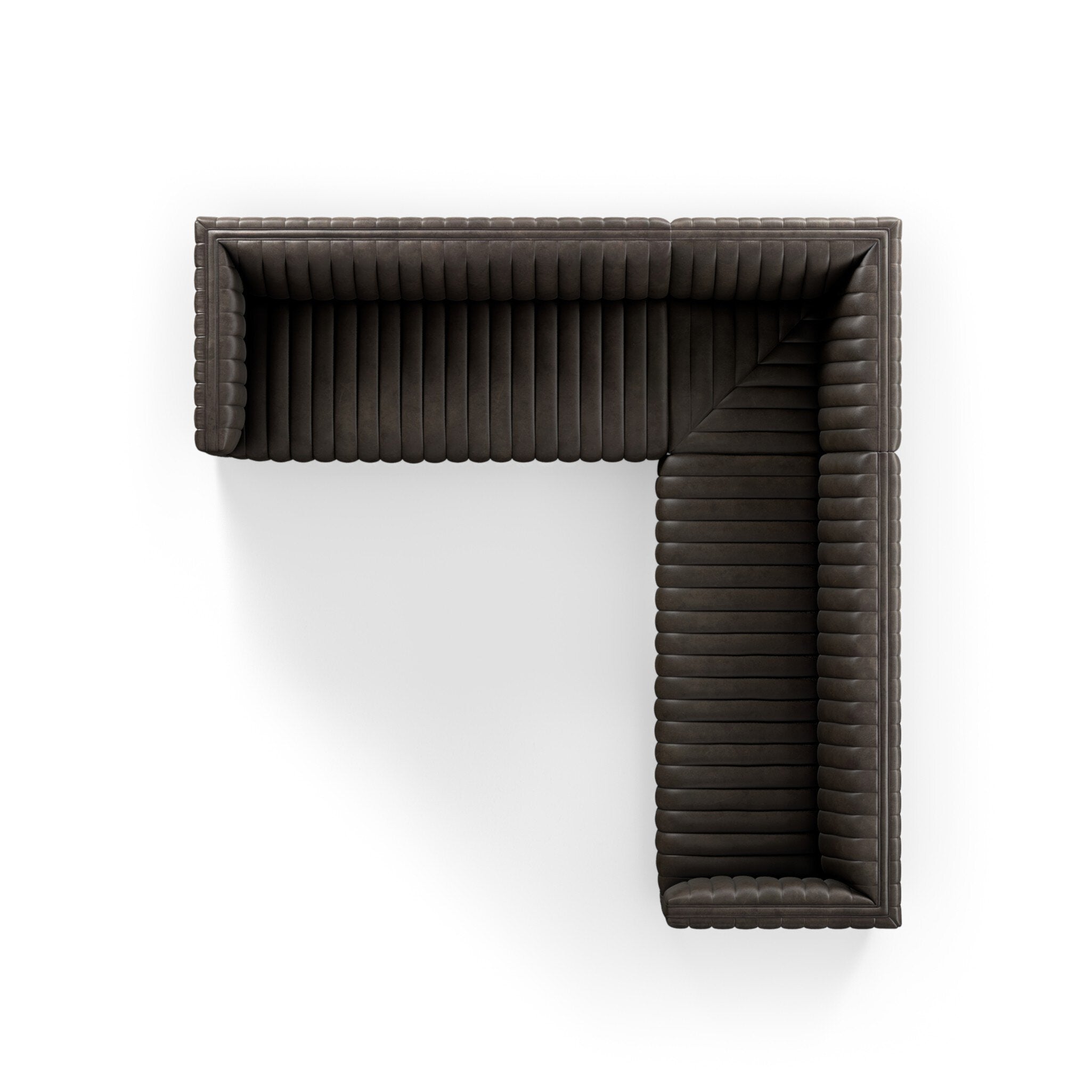 A dramatically channeled sofa wrapped in dark top grain leather creates a mature, clean look inspired by modern menswear. This three-piece sectional is perfectly sized for smaller spaces.
