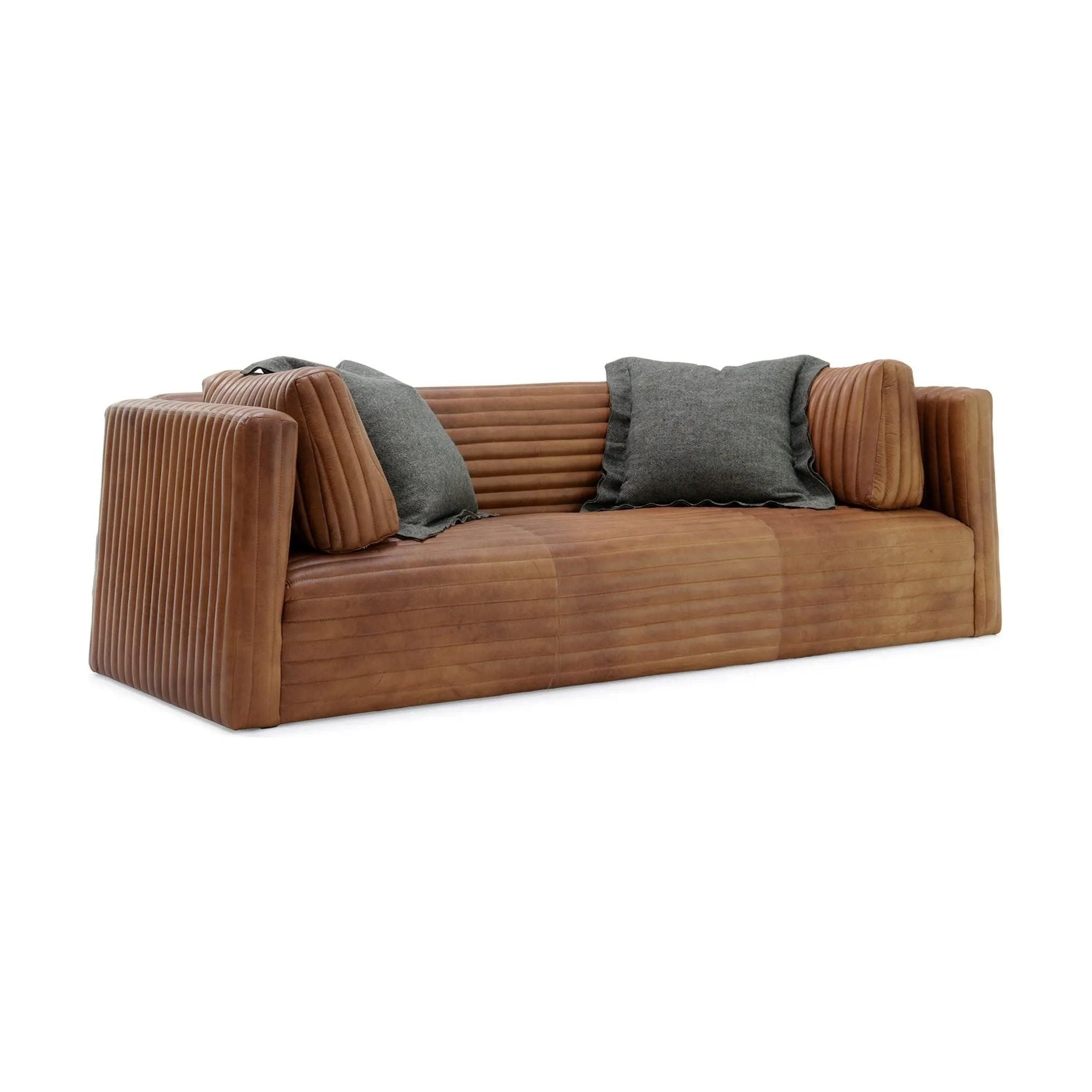 The Clemence Sofa features a minimalist design with clean, low-profile lines, complemented by plush cushions and luxurious throw pillows.