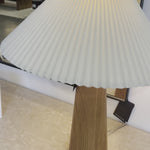 Modern minimal meets traditional. A tapered wood table lamp base is topped with a design-forward pleated shade.