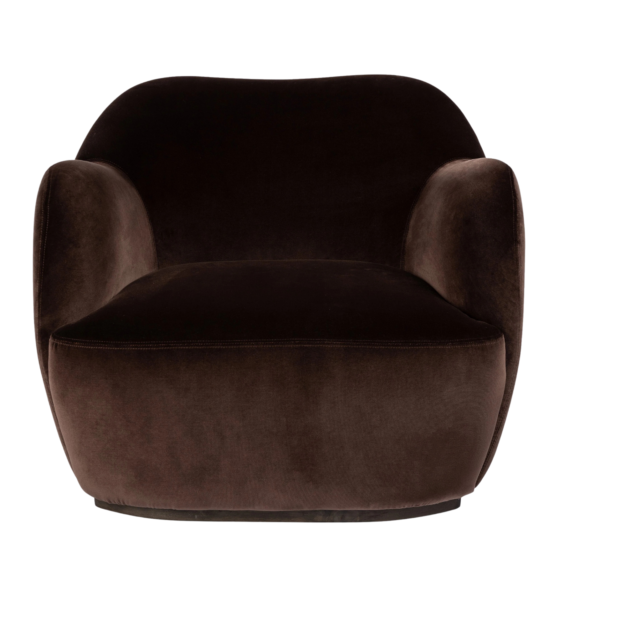 Featuring Julius Surrey Cocoa Swivel Chair by Four Hands at Amethyst Home. Velvety chocolate-brown upholstery pairs with an S-spring seat and enveloped frame for an inviting look and feel on this 360-degree swivel chair.