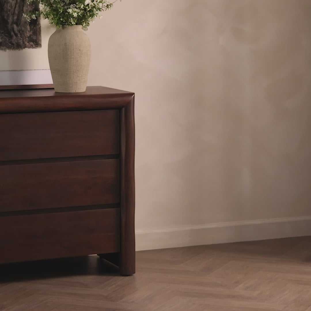 Made from solid acacia and finished in a rustic brown, a six-drawer, waterfall-shaped dresser features soft volume, mitered corners and a faux live edge.
