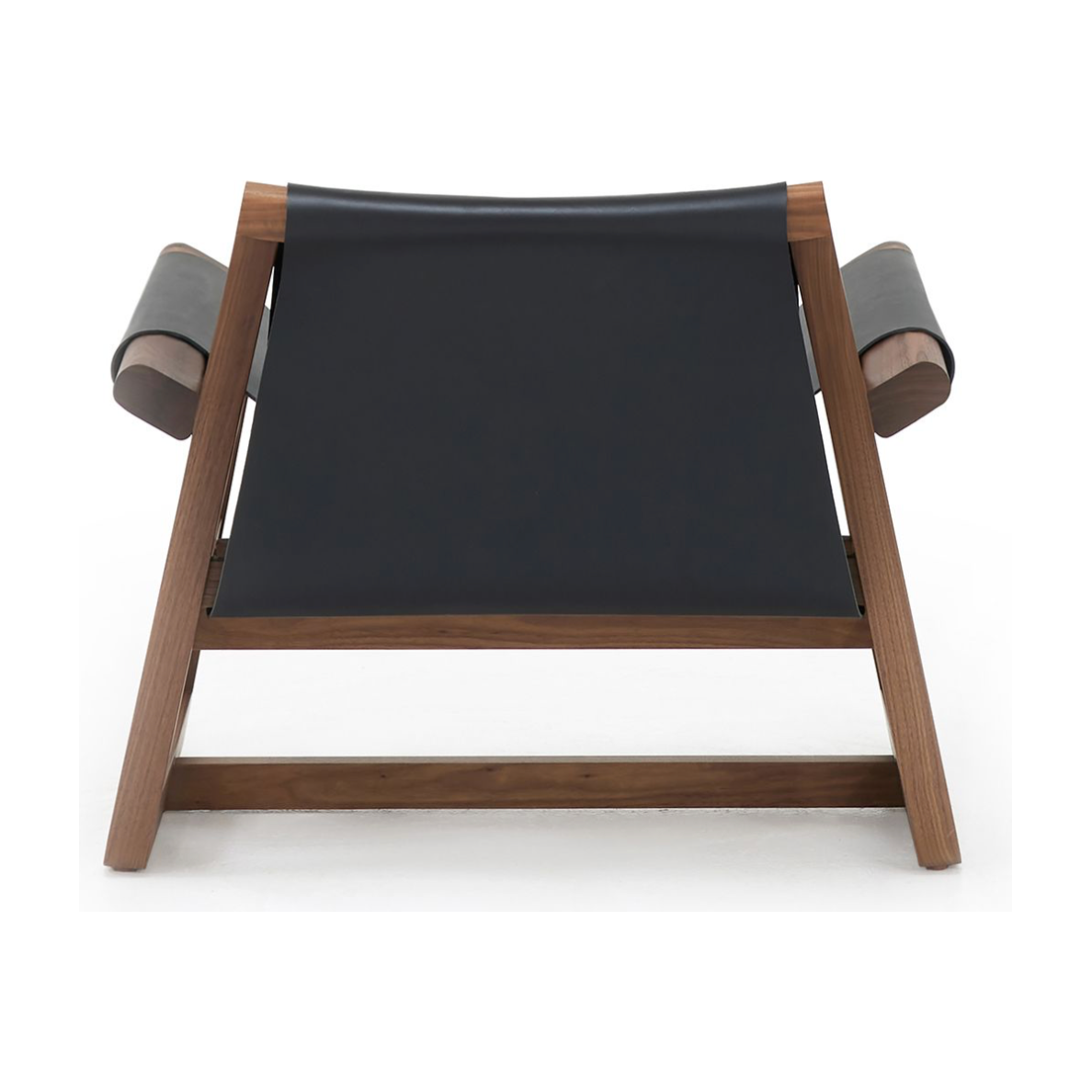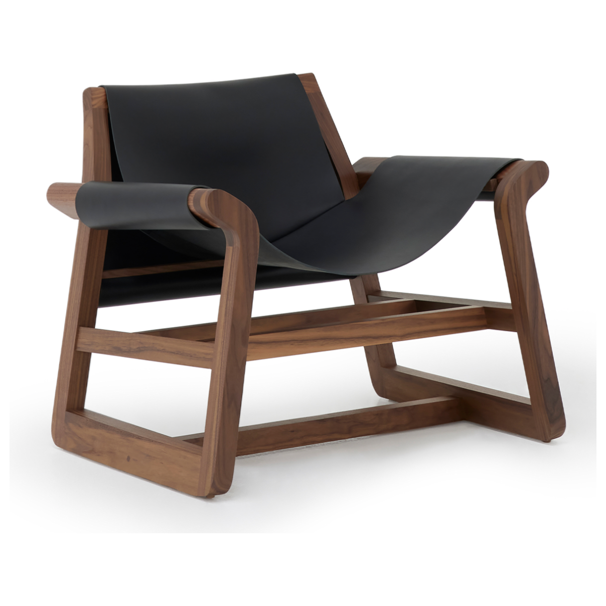 Welcome the luxurious leather sling to the Oakley Chair family, featuring a suspended seat in a sculptural hardwood frame.