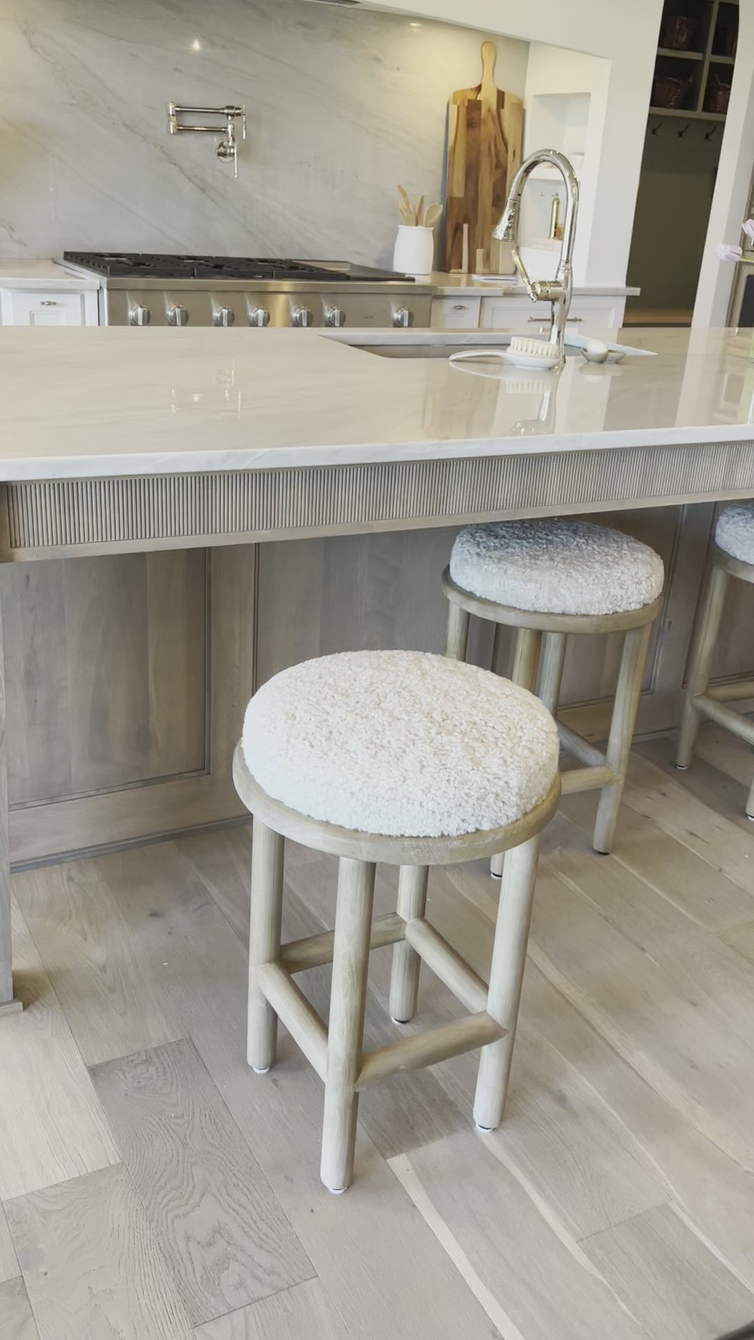 Featuring Saldino Stool by Four Hands at Amethyst Home. Bring a textural touch to the counter with the Saldino stool. Blonde-finished solid parawood supports rounded seating of soft beige shearling for comfort and style alike.