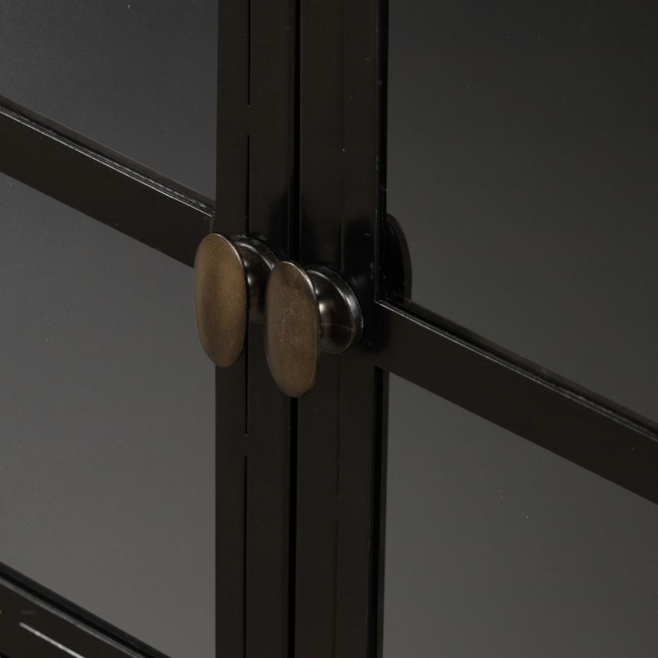 This Shadow Box Media Console Table gives your inner collector a place to play. Frame prized possessions in a glass enclosure with matte-black metal and brass knobs.