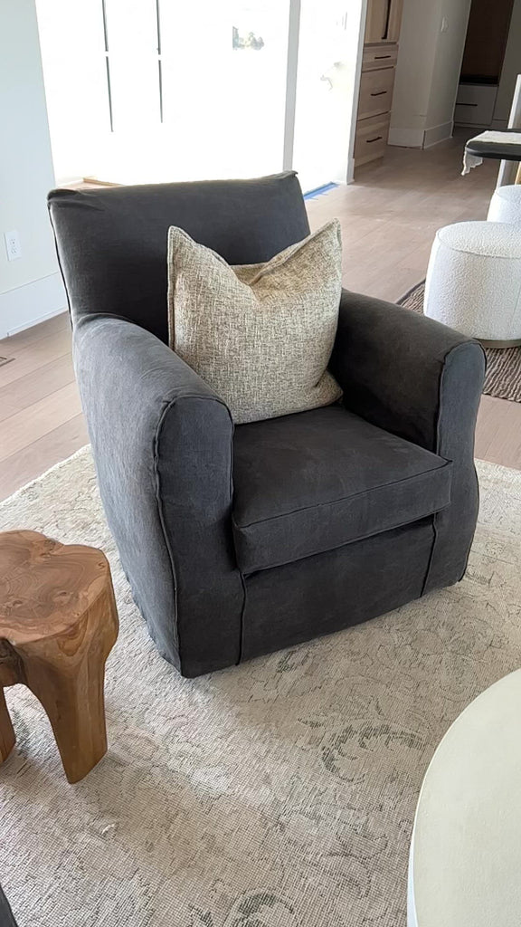 The Damien Swivel Chair features classic rounded arms, a supportive high back, and a supportive loose seat cushion, resting upon a playful swivel base. Amethyst Home provides interior design, new home construction design consulting, vintage area rugs, and lighting in the Seattle metro area.