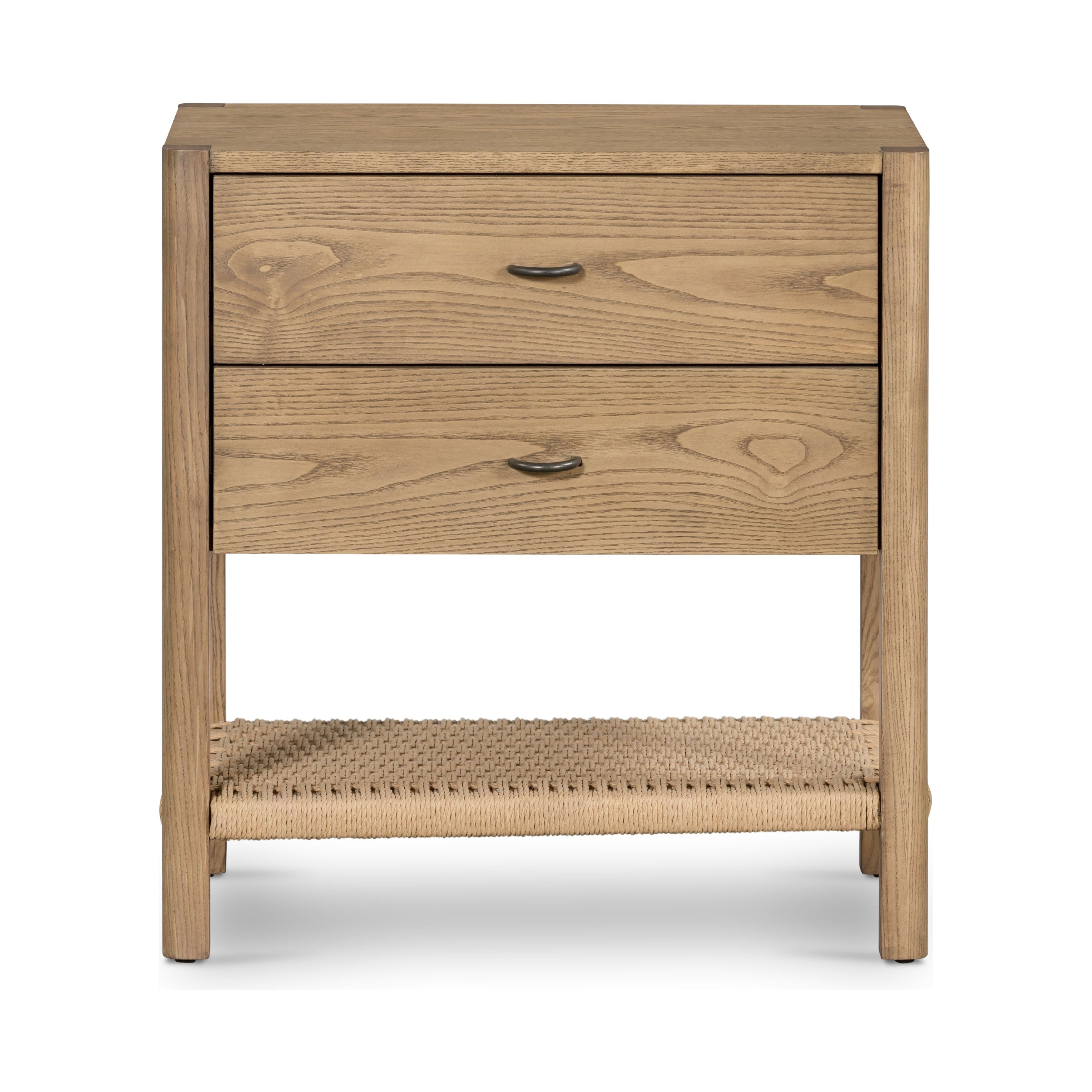 Featuring Rosedale Nightstand by Four Hands at Amethyst Home. The light-finished oak of this Rosedale Nightstand brings a clean, brightness to any room. We love how the two spacious drawers have iron hardware wrapped in a gorgeous, tan leather. The dimension legs with iron connecting them bring a unique look to your bedroom or other area!