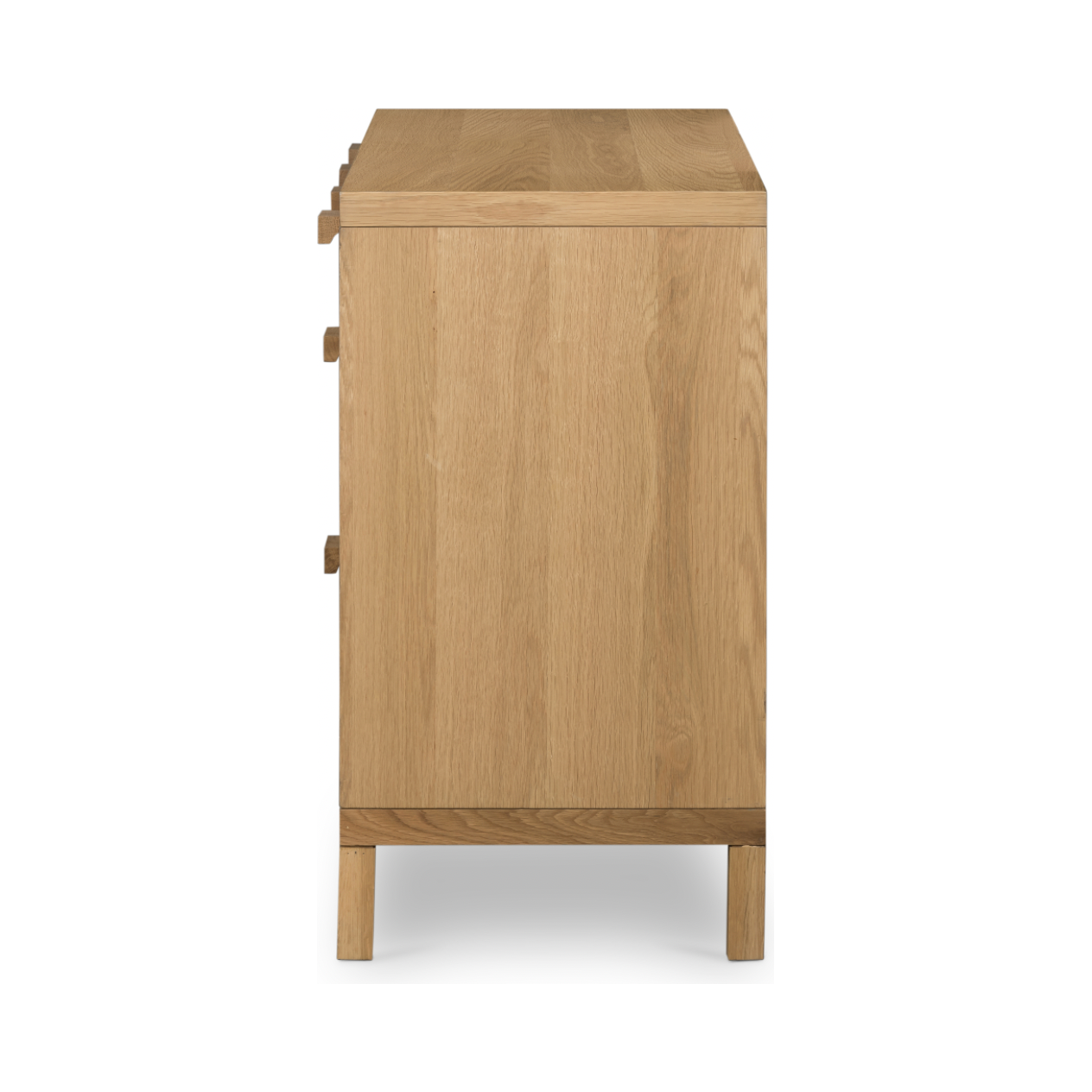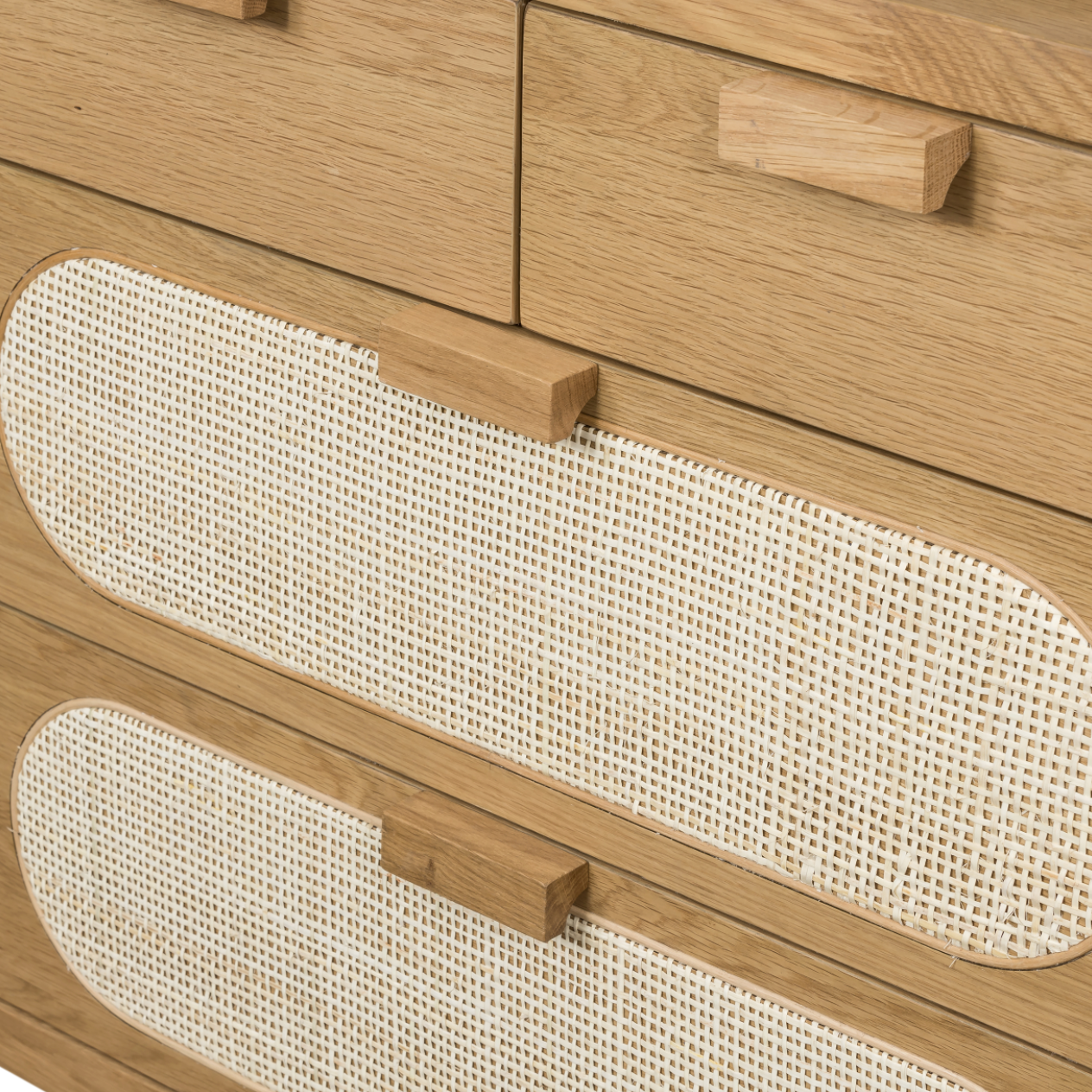 This Allegra 8 Drawer Dresser - Natural Cane is made of a gorgeous, honey-finished oak. With eight spacious drawers and wood-backed cane paneling, the soft, neutral look brings to life to any bedroom.