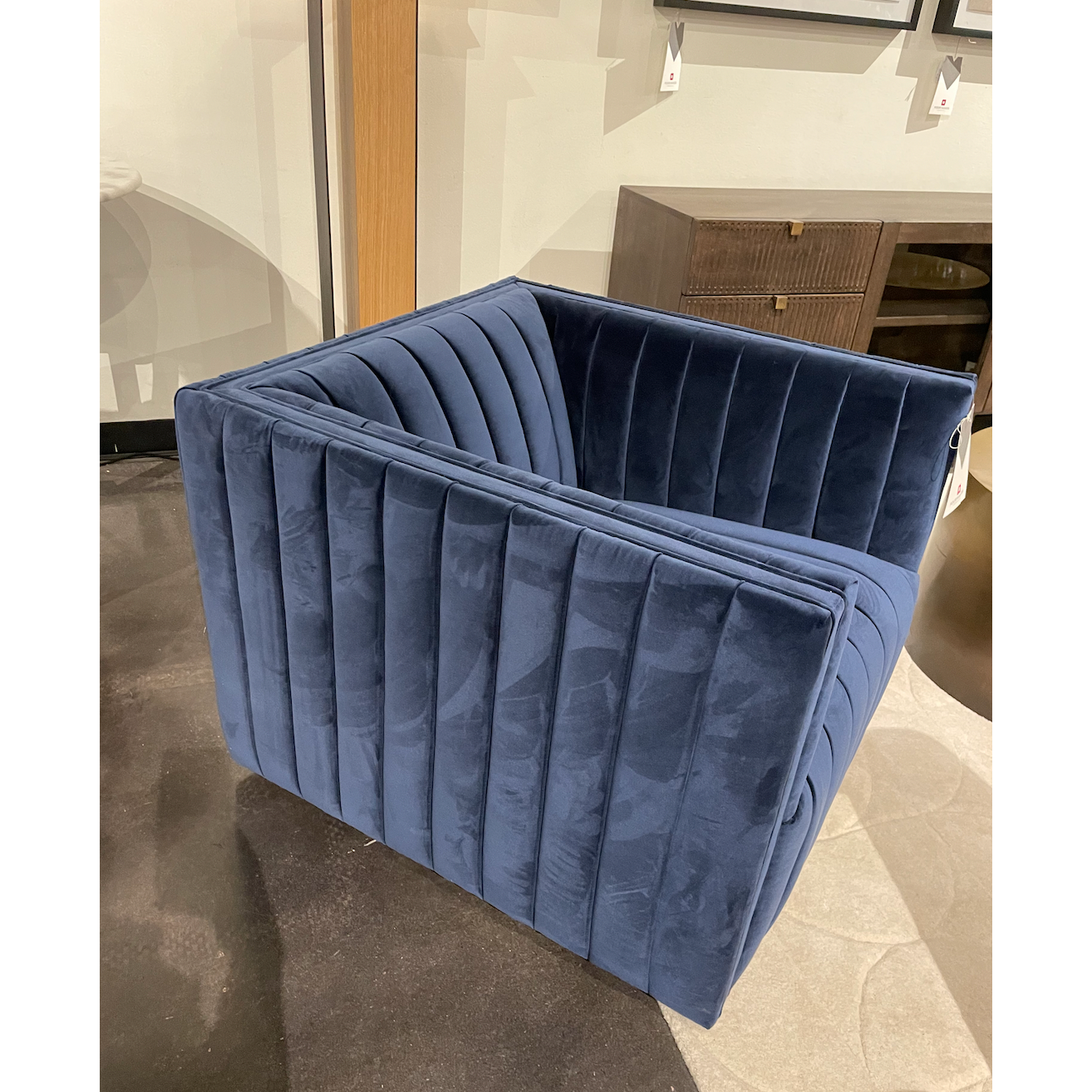 Featuring Augustine Swivel Chair - Sapphire Navy by Four Hands at Amethyst Home. A modern take on classic library chair, the Augustine Sapphire Navy Swivel Chair is a luxurious poly-blend navy seating that takes on dramatic channeling for trend-forward texture and sumptuous sit. Swivel feature amps up fresh appeal from every angle.