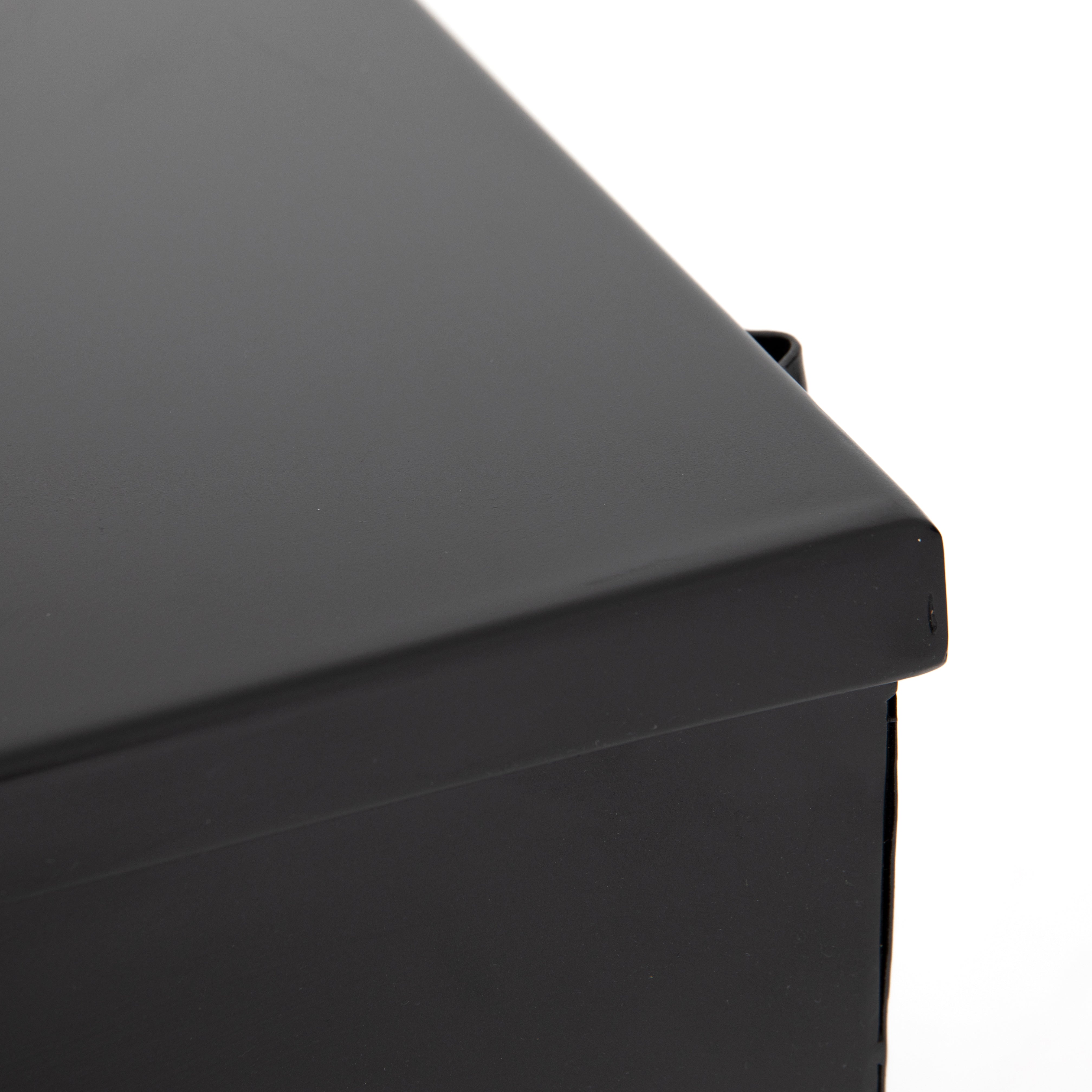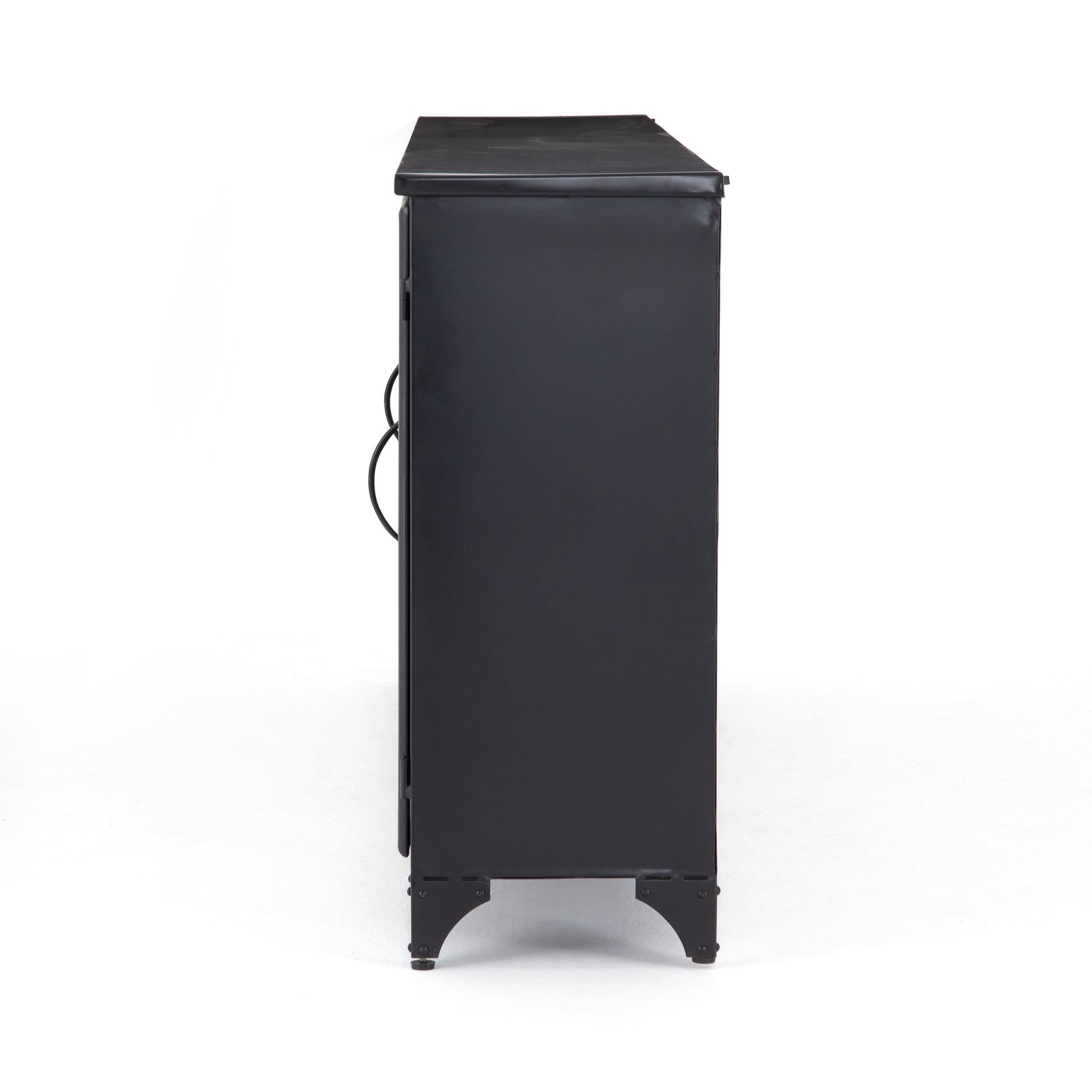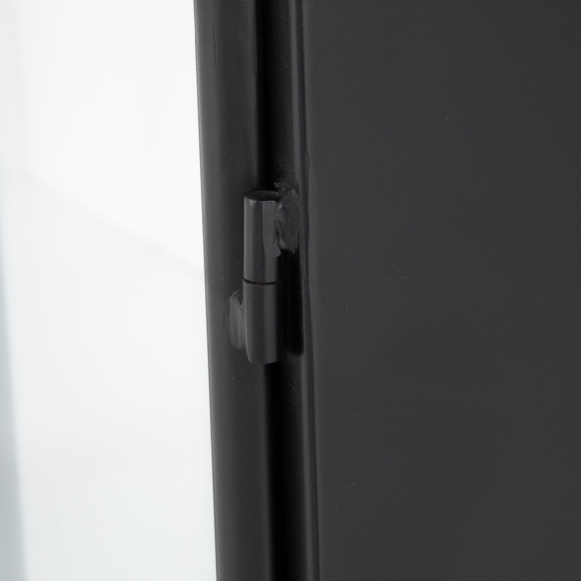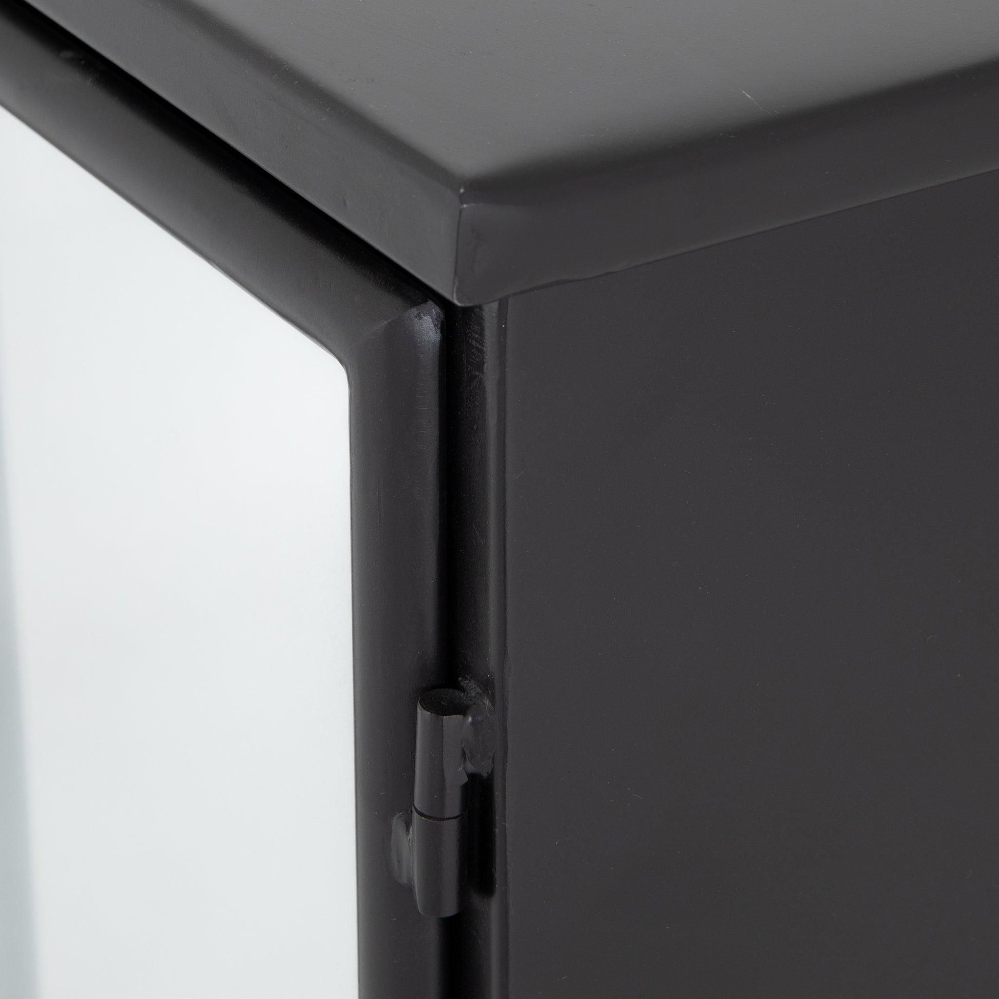 A black iron frame with windowpane detail contrasts a stark white interior for an updated take on the traditional media console. Open-front glass doors and ample shelving maximize storage and display options.