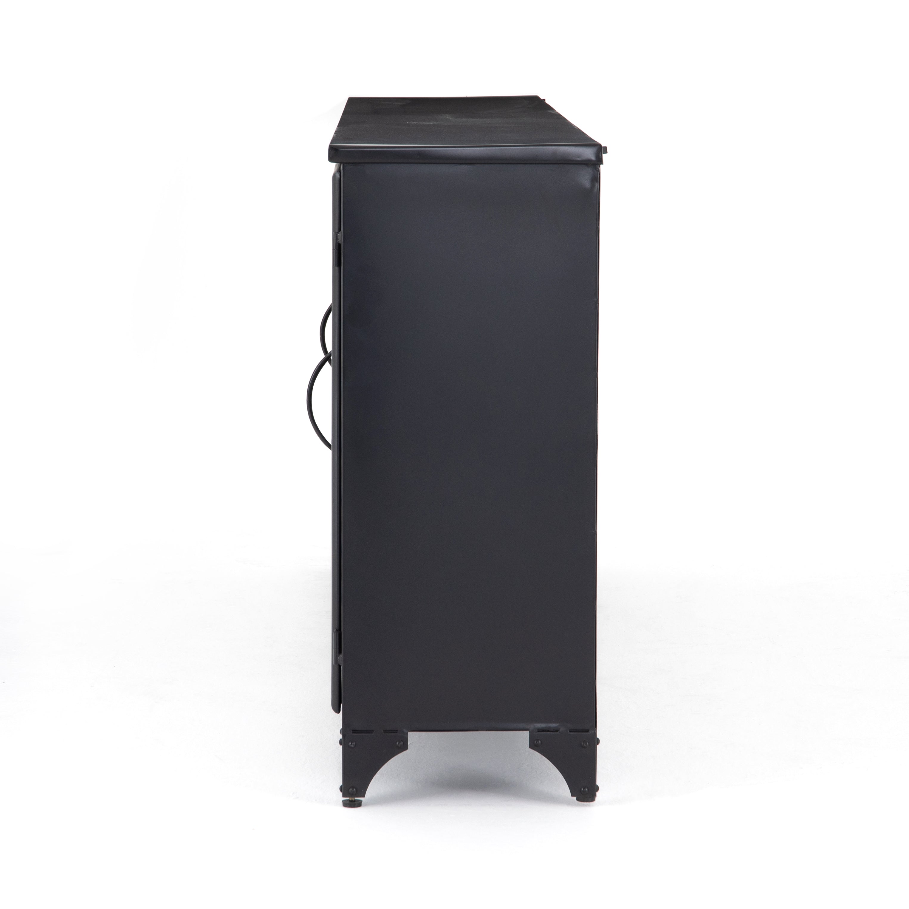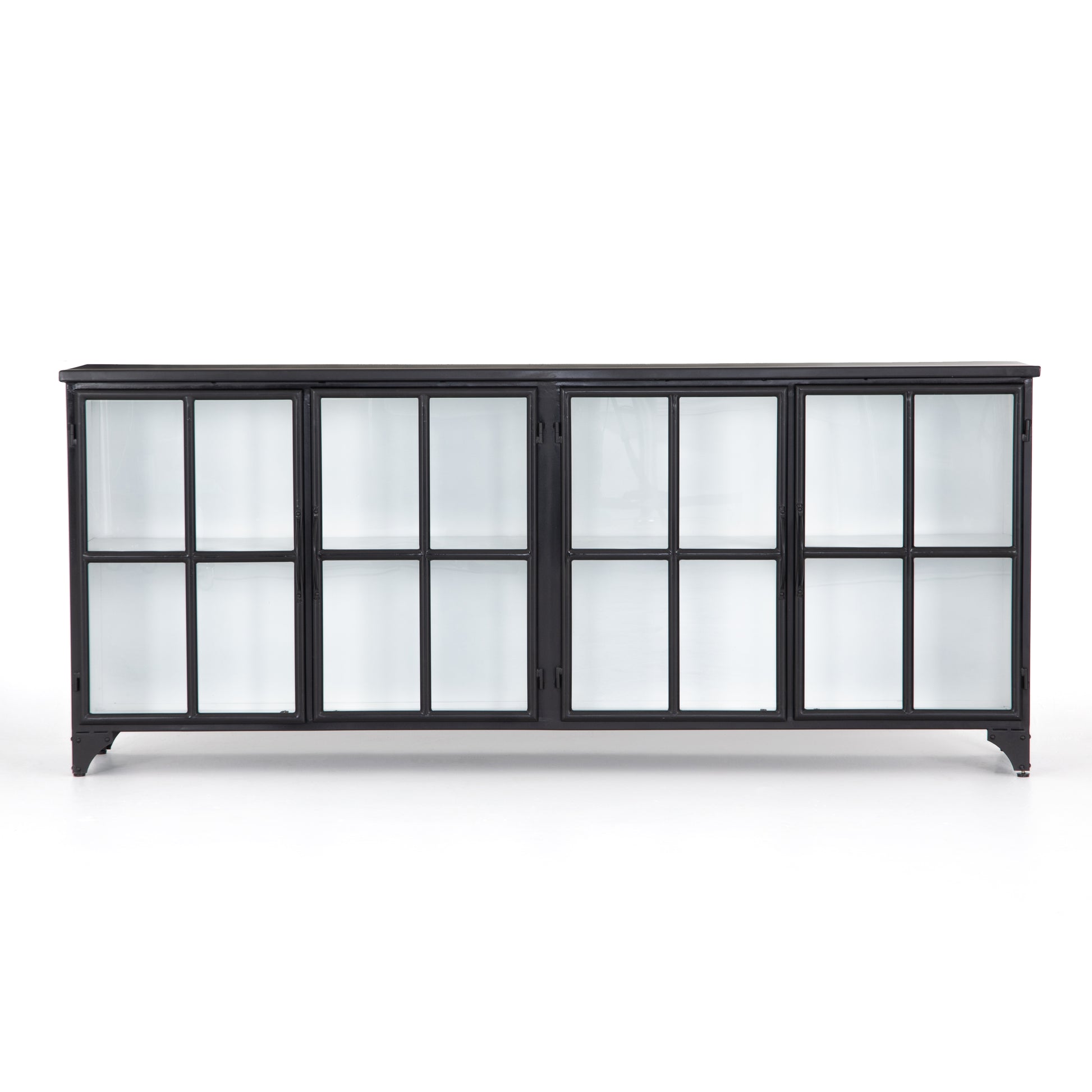Featuring Camila Sideboard by Four Hands at Amethyst Home. A black iron frame with windowpane detail contrasts a stark white interior for an updated take on the traditional media console. Open-front glass doors and ample shelving maximize storage and display options.