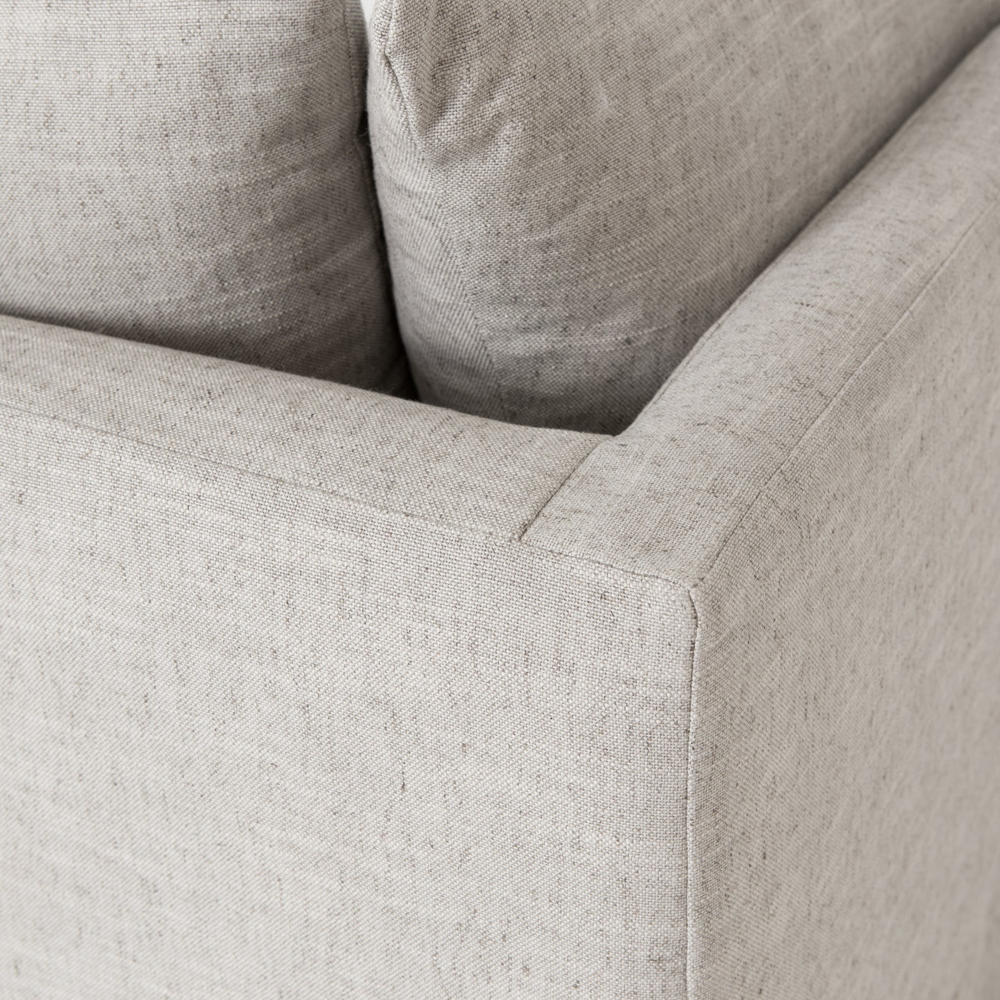 Loungey and slipcovered, the Habitat sofa is made for modern living. Shelter arms and pillow-inspired cushions are covered in comfortable, durable, and stain-resistant performance fabric. The thread within the fabric itself is doused in a material meant to prevent it from becoming stained and to resist as well as inhibit the growth of bacteria.