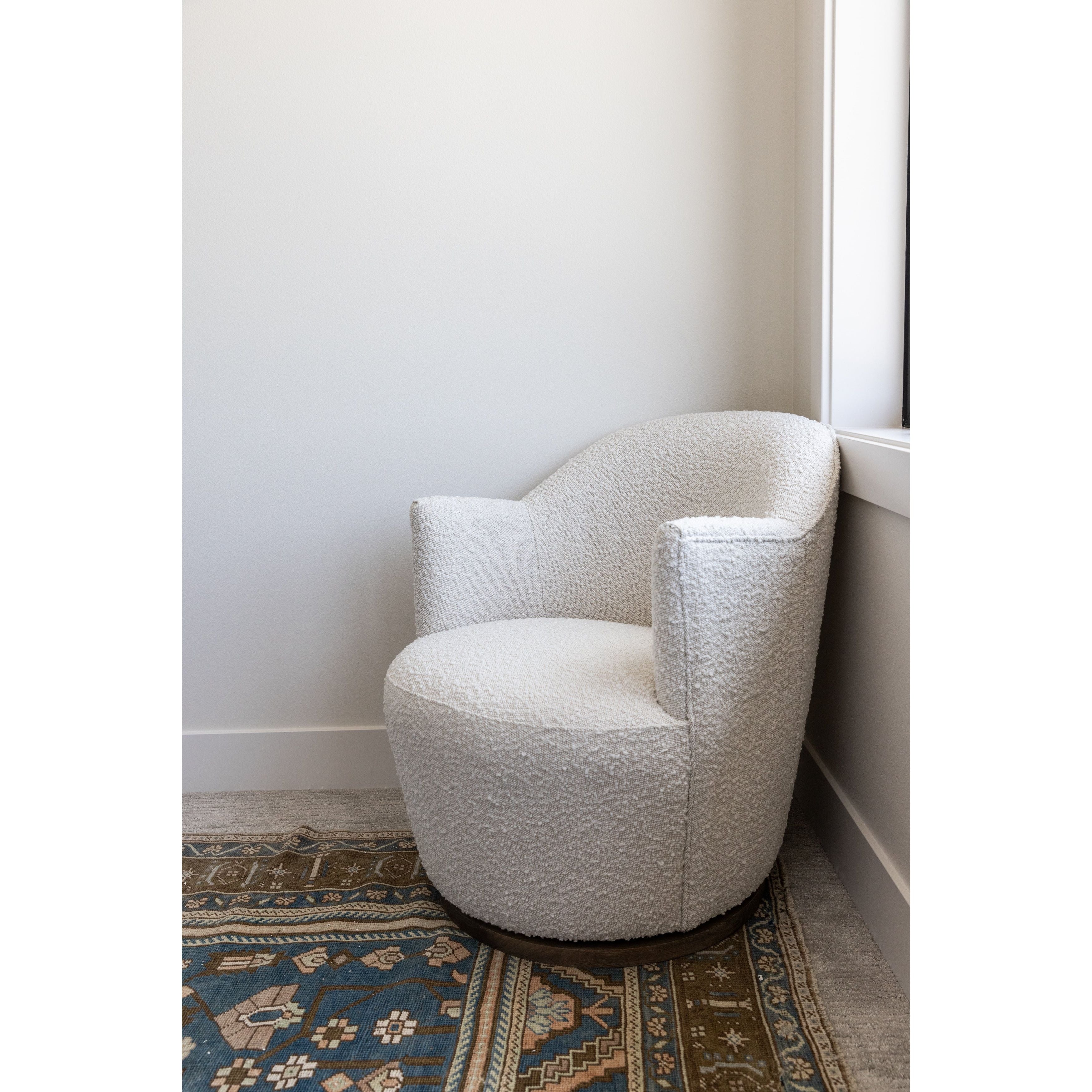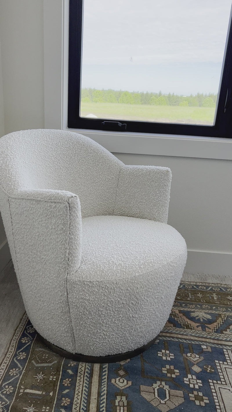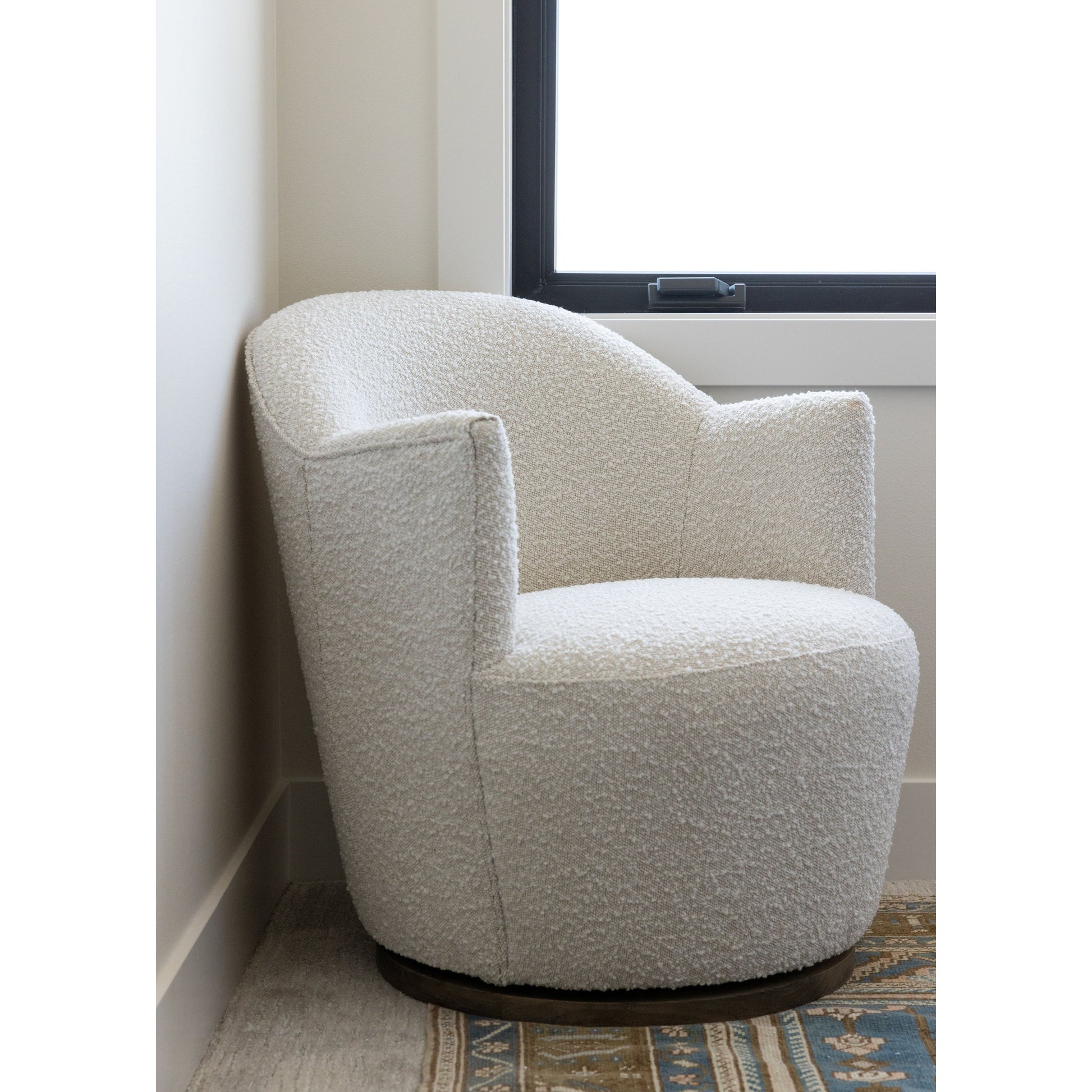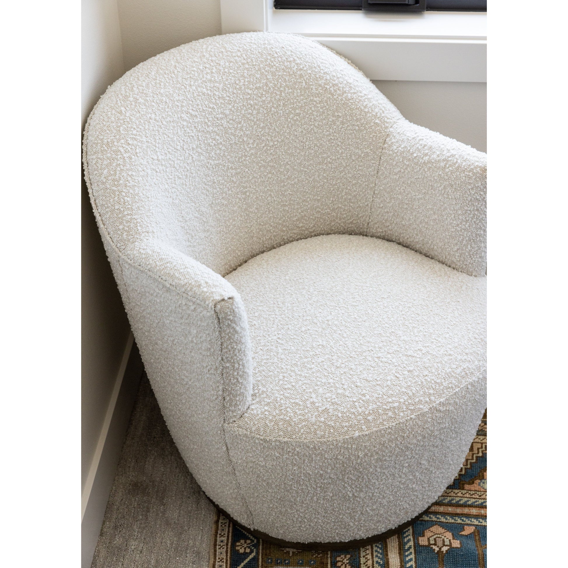 We love the drum-style seating of this Aurora Swivel - Knoll Natural. Upholstered in a soothing and textural off-white bouclé, this also features a swivel base - perfect for your office, living room, or other space!  Overall Dimensions: 26.00"w x 31.50"d x 31.00"h