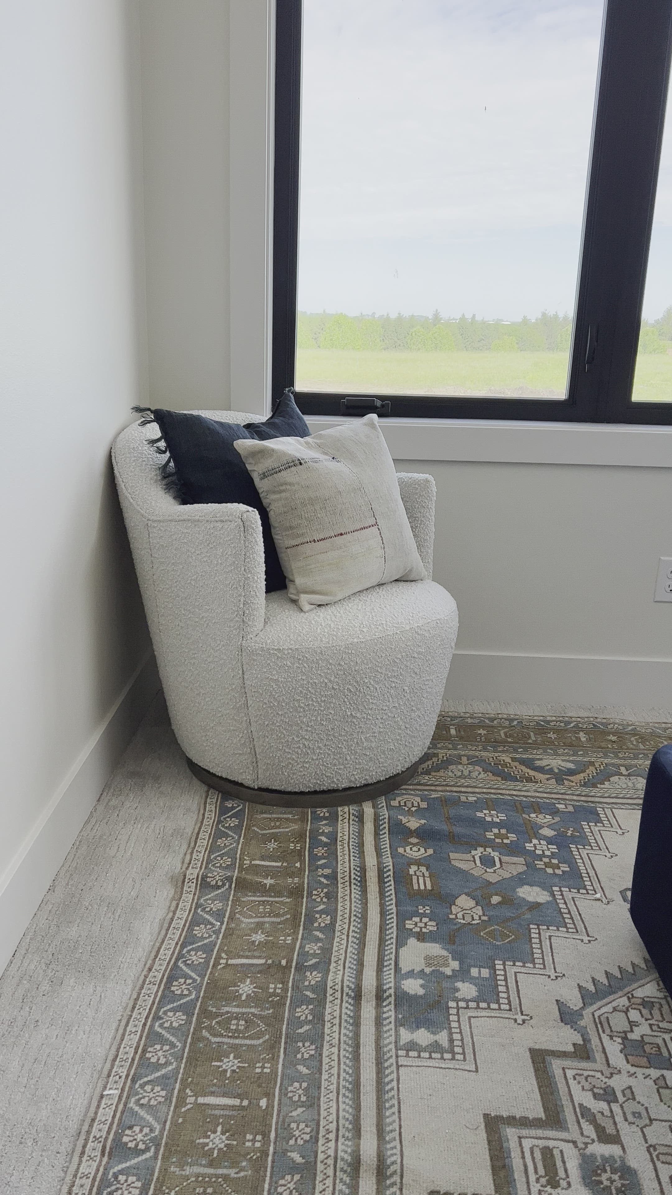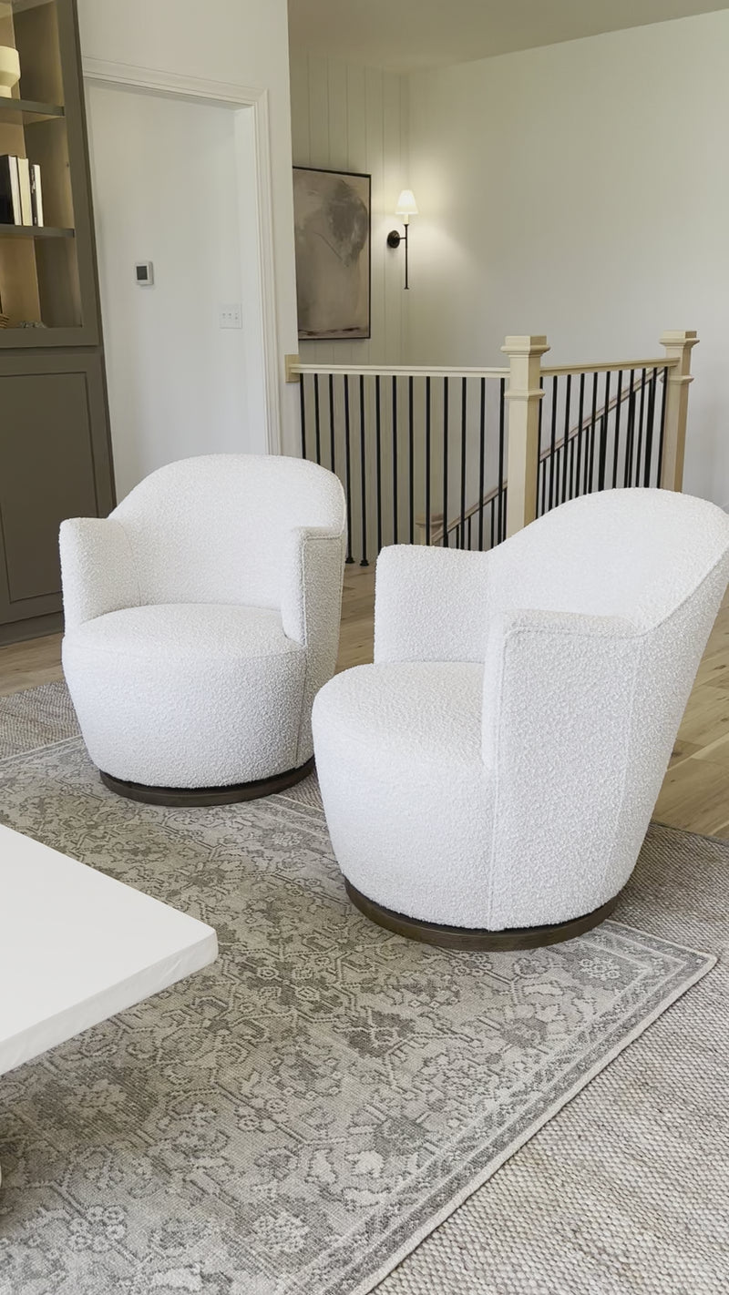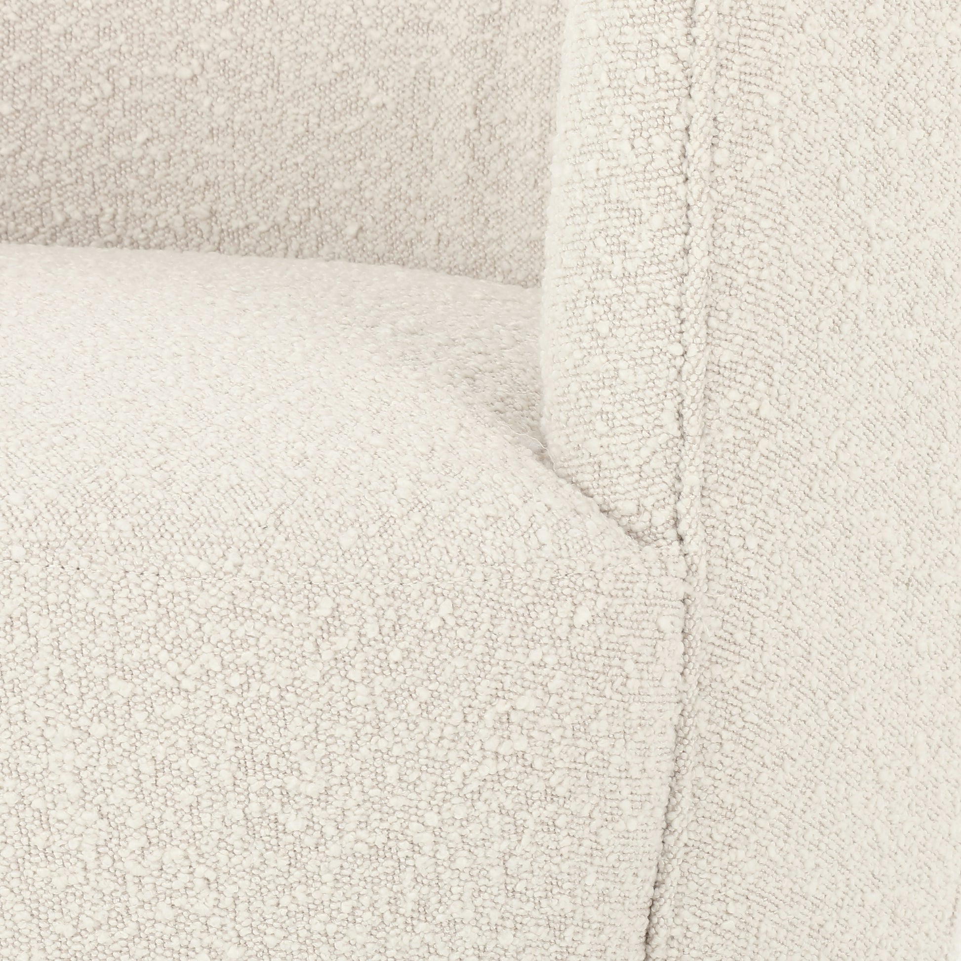Warm modern French-inspired boucle fabric with soft curves -- the Aurora swivel chair is an Amethyst essential.  It may look petite but we have found its comfortable for all body types without feeling clunky in a space.