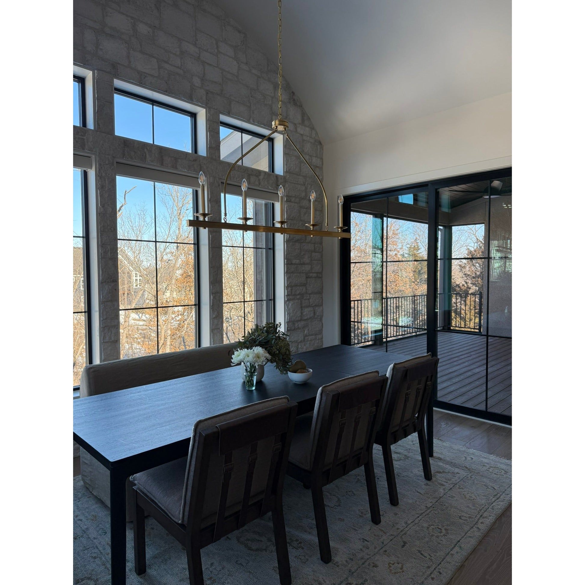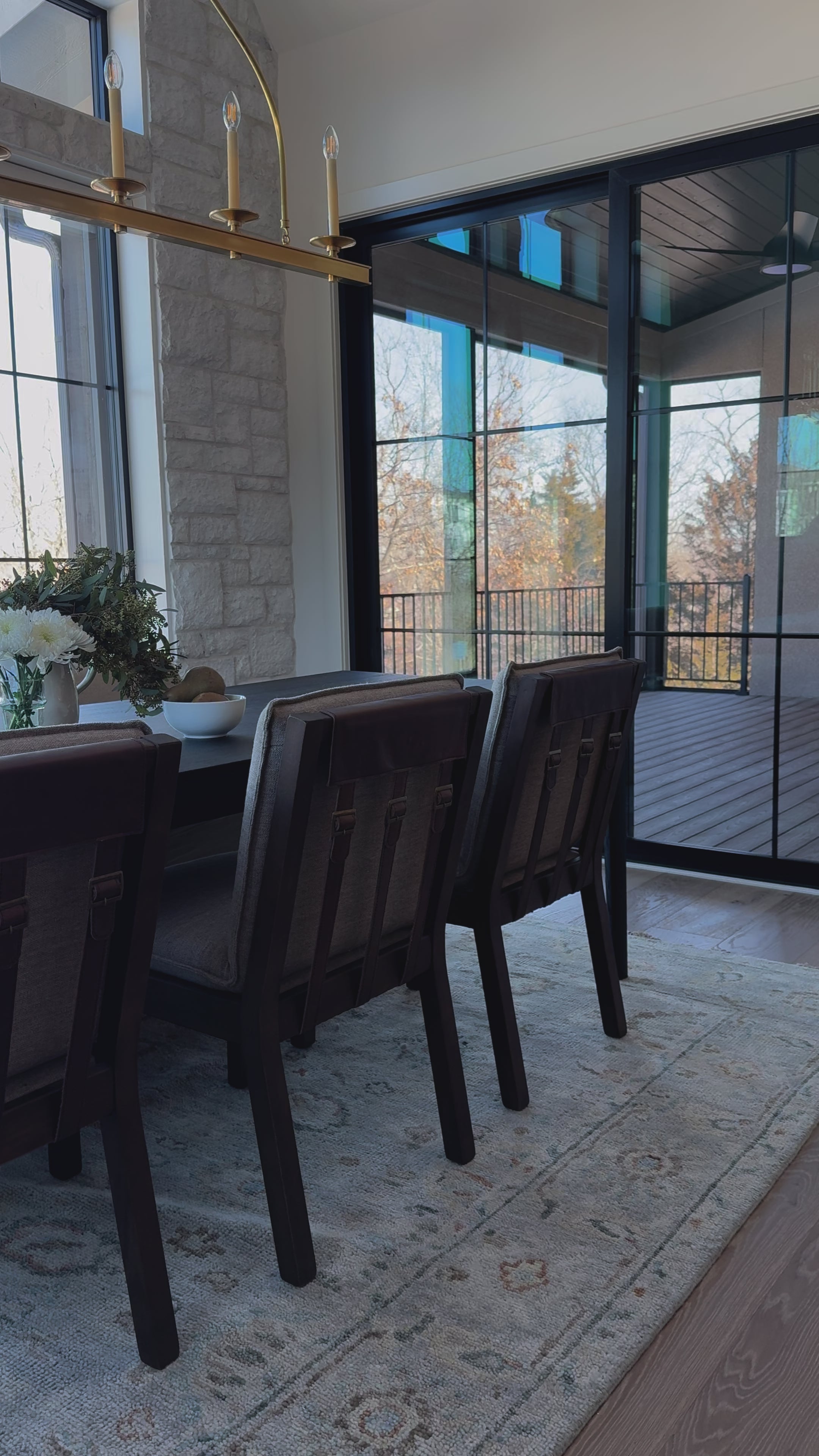 An Amethyst fave -- the Wilmington dining chair has a gorgeous coffee colored textile paired with medium toned wood and interesting leather buckles on the back -- we tied in the gold buckles with the gold chandelier above!  Inspired by the folded pillow form, the seat and back cushions of this parawood dining chair are covered in performance fabric. The chair back features leather strap details for a mixed material touch.