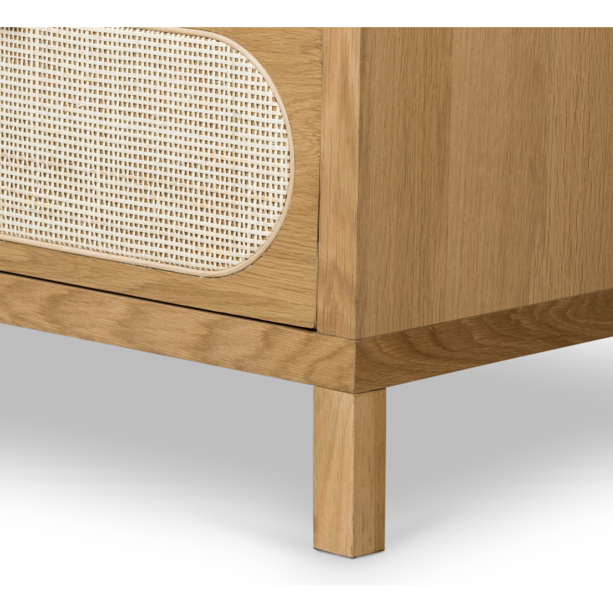 This Allegra 8 Drawer Dresser - Natural Cane is made of a gorgeous, honey-finished oak. With eight spacious drawers and wood-backed cane paneling, the soft, neutral look brings to life to any bedroom.
