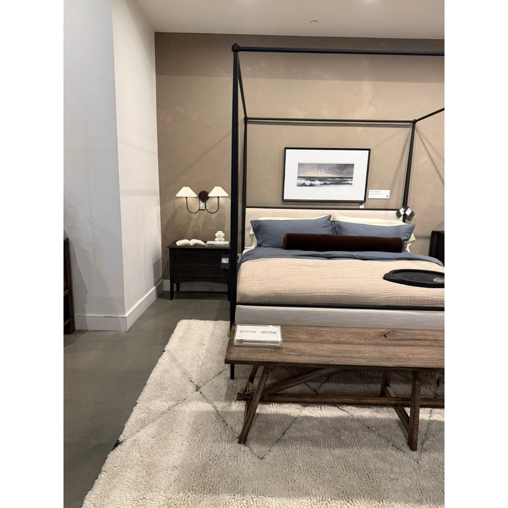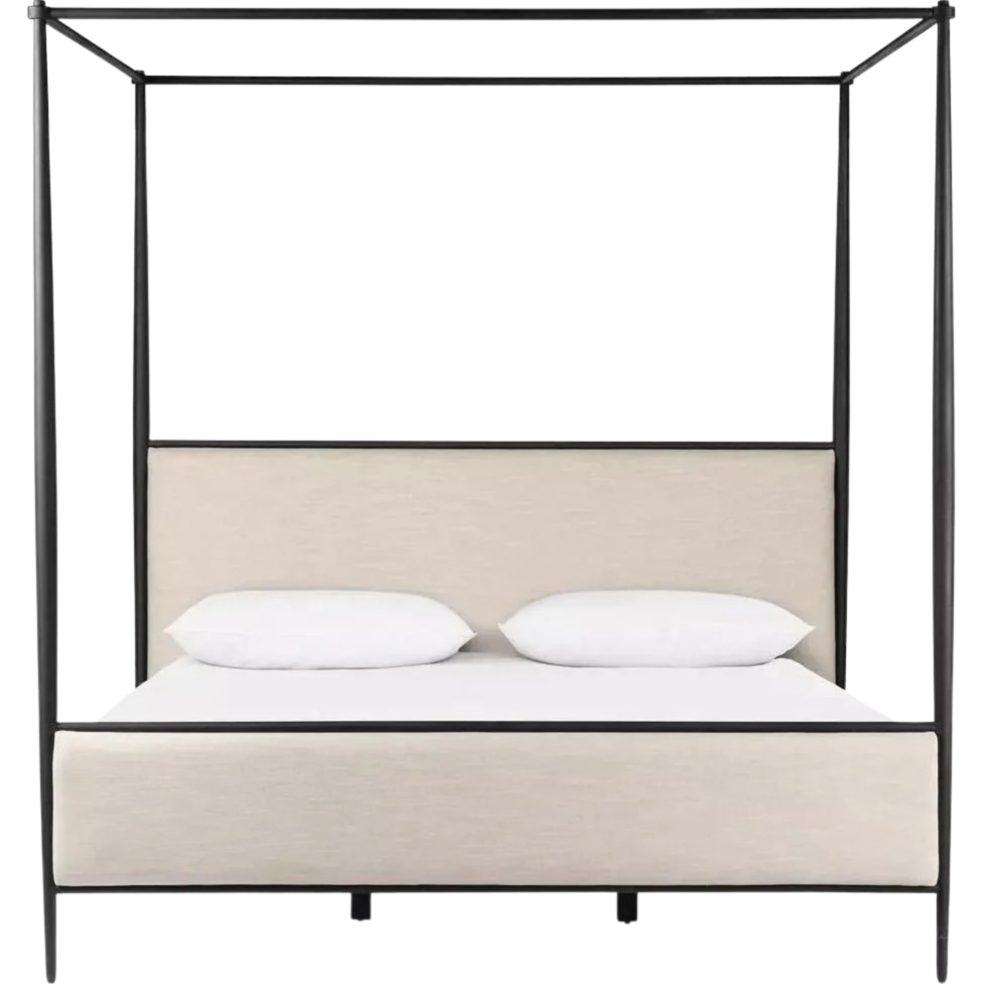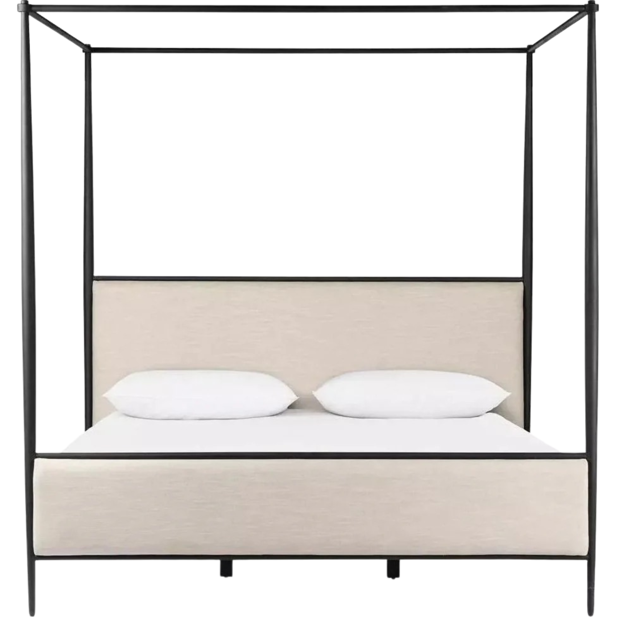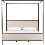Featuring Xander Savoy Parchment Canopy Bed by Four Hands at Amethyst Home. Streamlined and refined. Tapered at the top and bottom, this textured black iron canopy bed fashions a comfortable headboard upholstered in a classic cream hue for contrast.