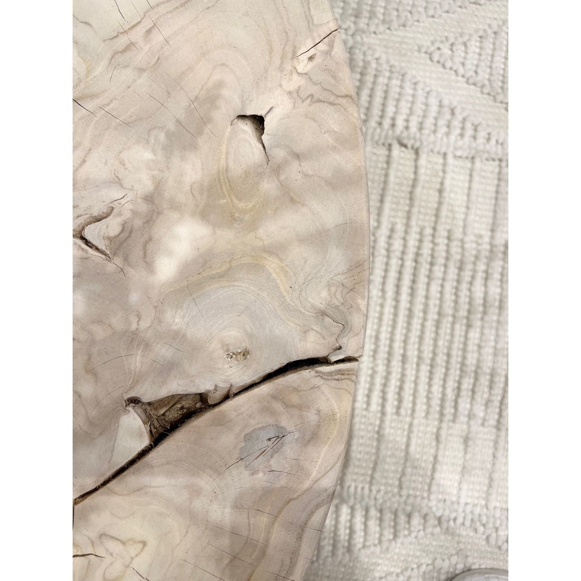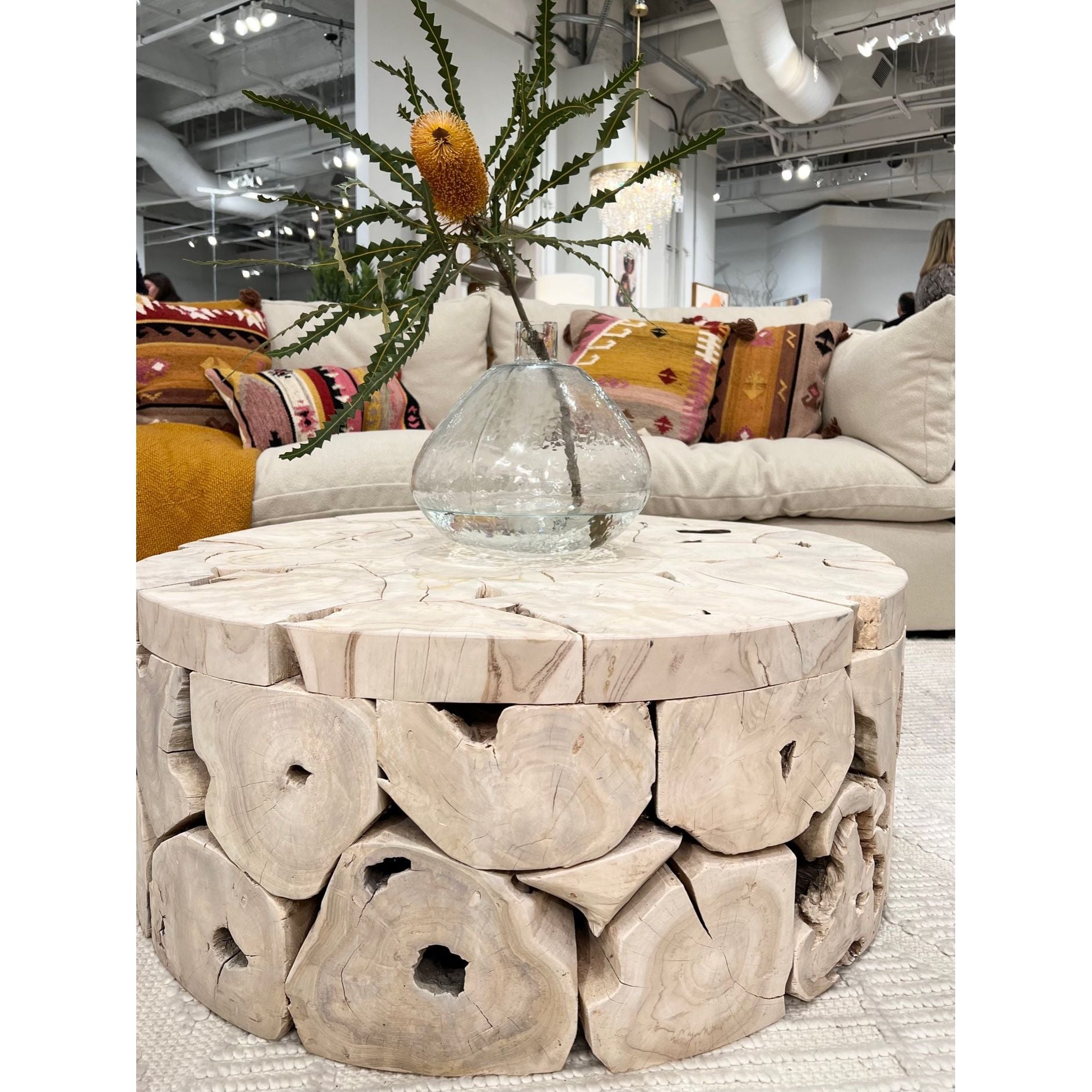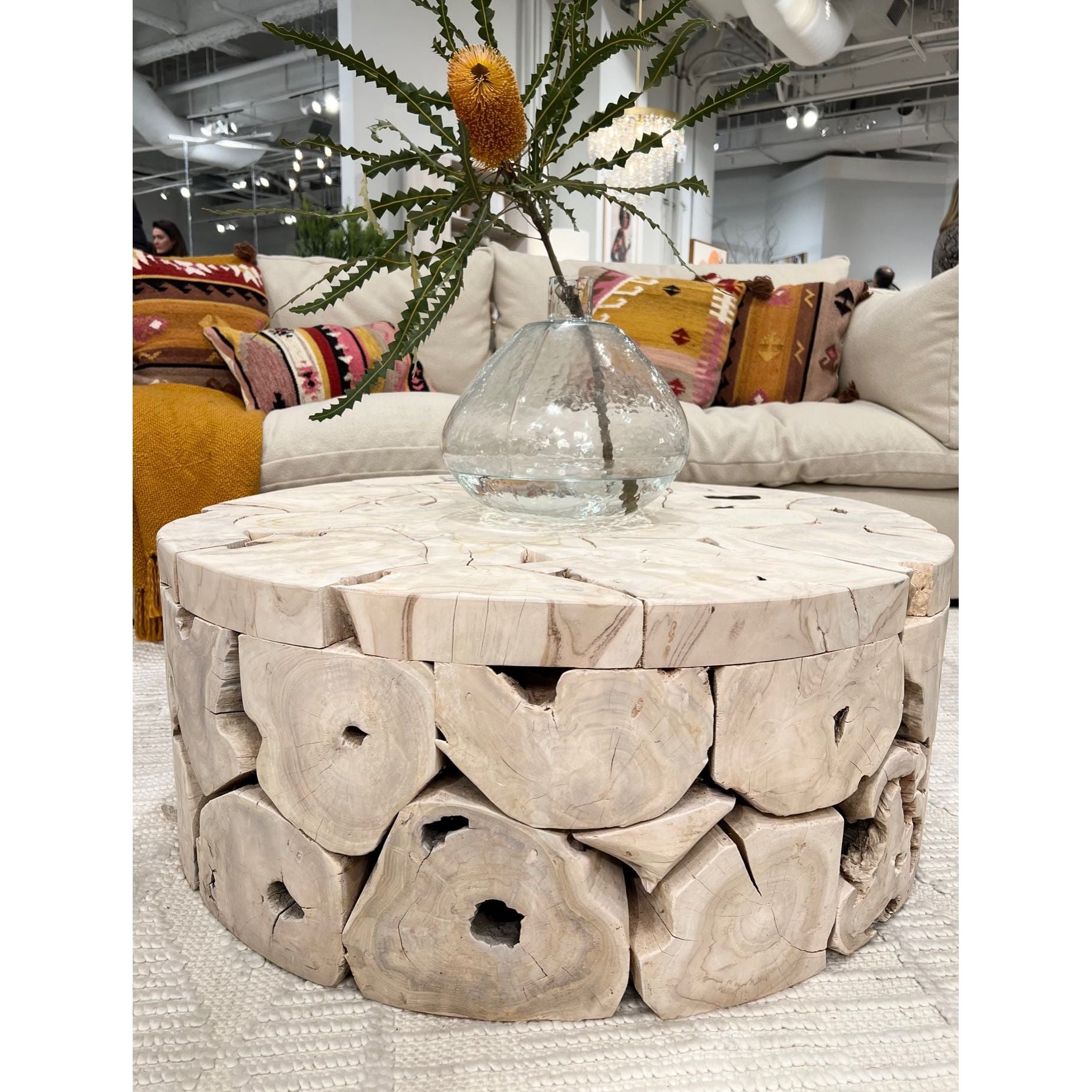Featuring Briar Round Coffee Table by Dovetail at Amethyst Home. This beautiful Briar Round Coffee Table is pieced together from reclaimed slabs and chunks of solid teak wood finished in a bleached finish with exquisite craftsmanship. Artisans build each coffee table like a puzzle, fitting each piece together in combinations that are never duplicated. Like true works of art, no two will be exa. Amethyst Home provides interior design services, furniture, rugs, and lighting in the Dallas metro area.