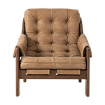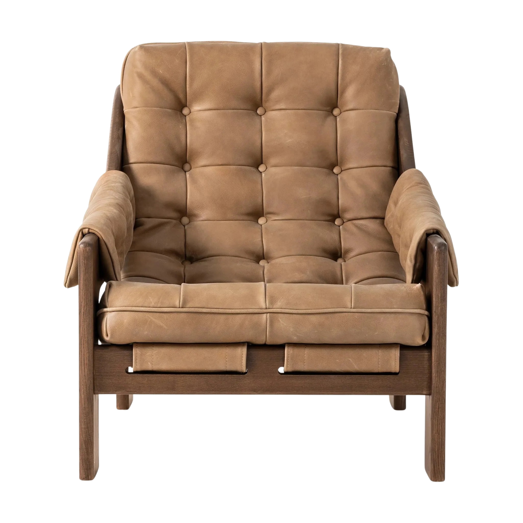 Dramatically tufted and angled for comfort, this Seventies-inspired sling seat is made from thick-cut top-grain leather in an earthy taupe, with wide brown ash framing. A plump, pronounced grain accentuates leather's natural markings for a supple, lived-in look.