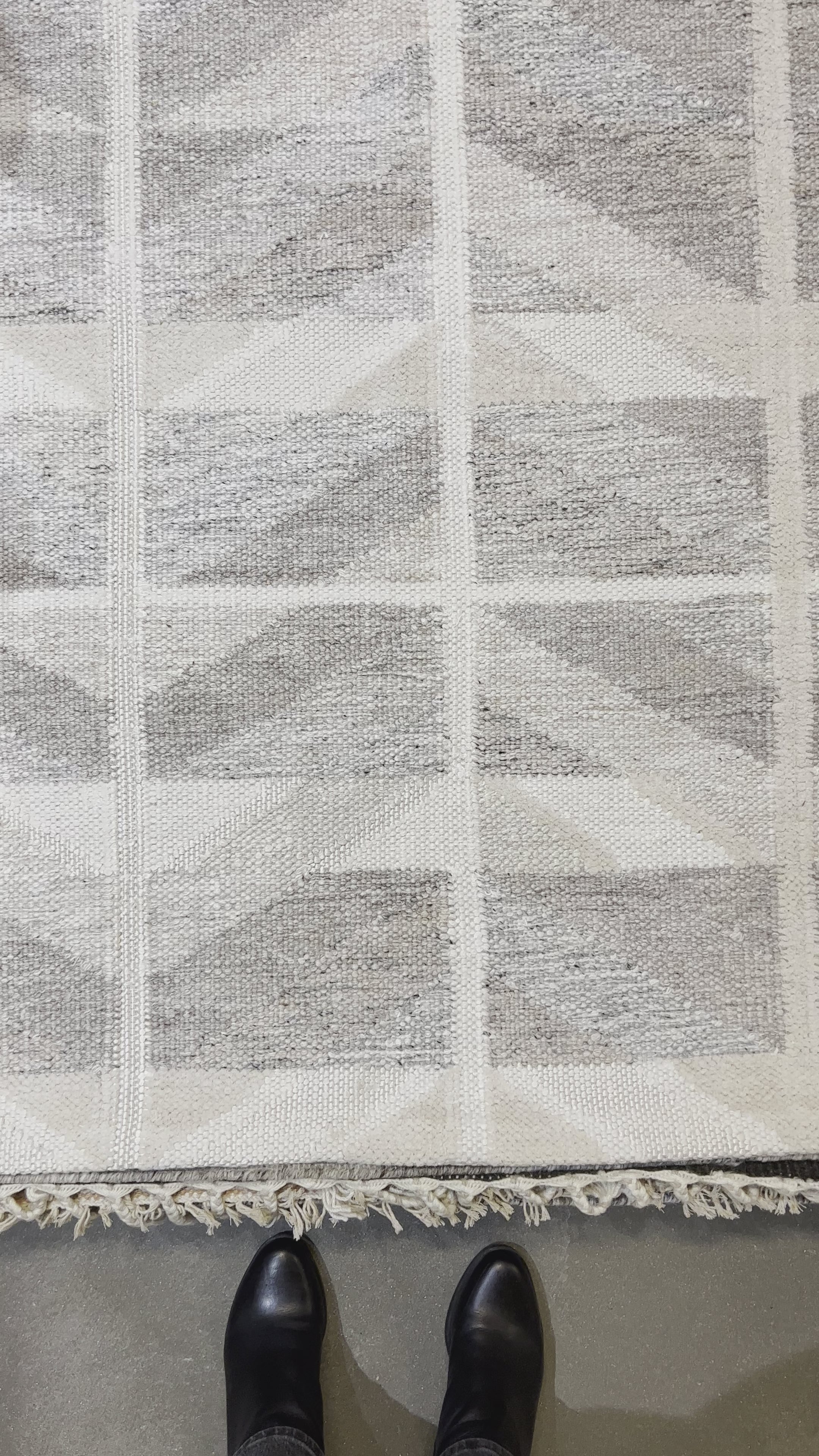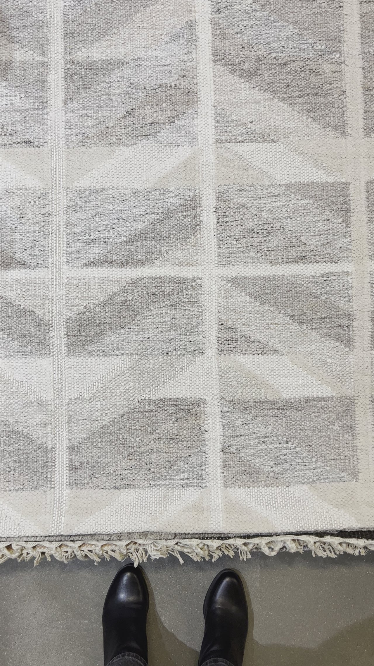 A beautiful, tone on tone flat weave rug -- reminds us of the all the love that goes into a quilt!  Vacuum normally and clean up spills immediately.