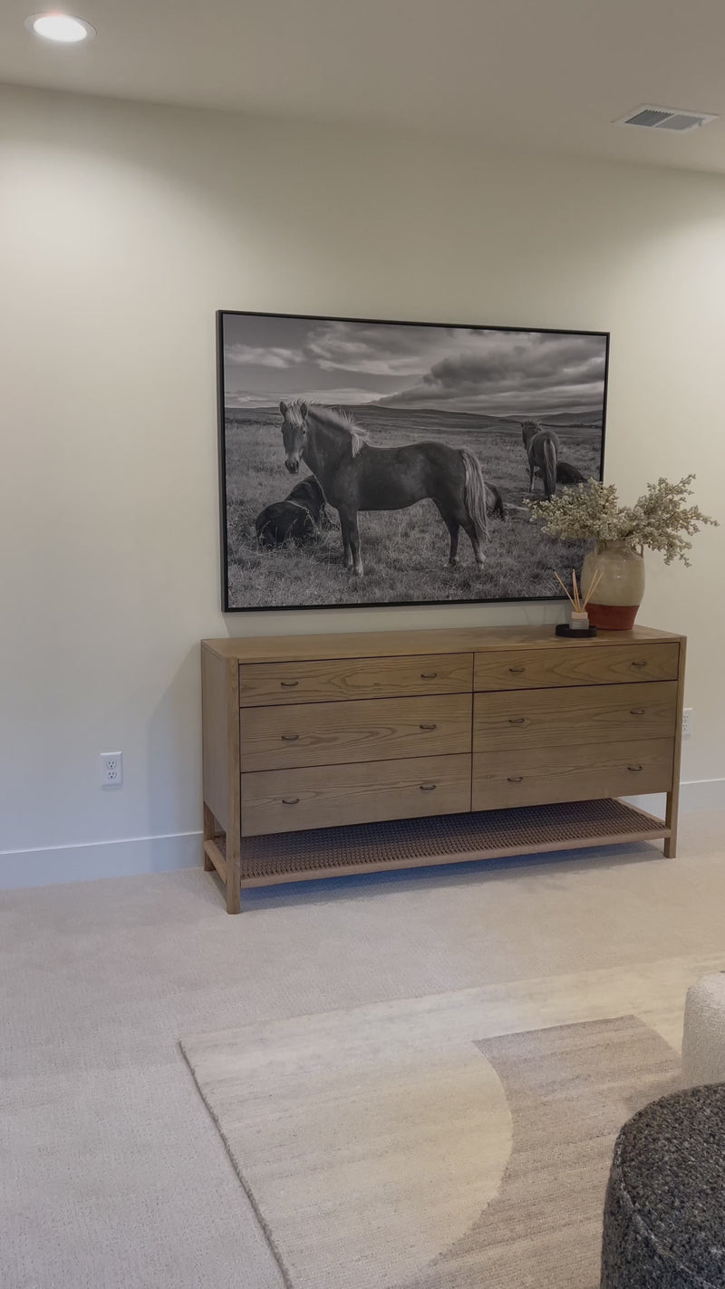Simple yet refined, the Zuma Dune Ash 6 Drawer Dresser is a danish design-influenced dresser that is made from solid ash, with iron hardware finished in a sleek gunmetal. Stretcher-style shelving made from woven paper cord serves up a textural finishing touch. Six spacious drawers bring generous storage space to the bedroom. Amethyst Home provides interior design, new home construction design consulting, vintage area rugs, and lighting in the San Diego metro area.