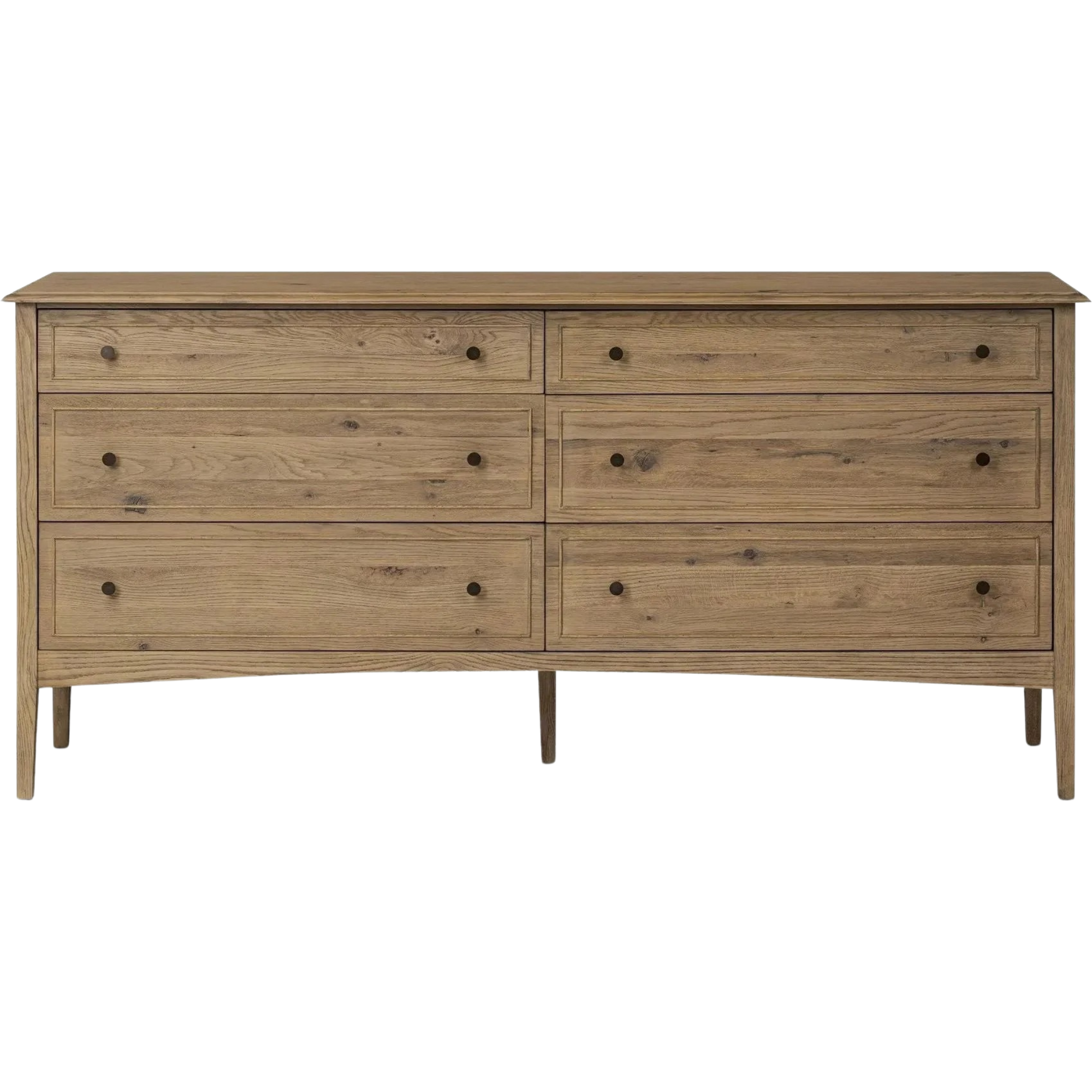A cleanly shaped six-drawer dresser is crafted from aged smoked oak, highlighting the wood's natural grain. Roomy drawers offer plenty of space for bedroom storage, while the slim, tapered legs give the piece a subtle lift, creating a grounded look.