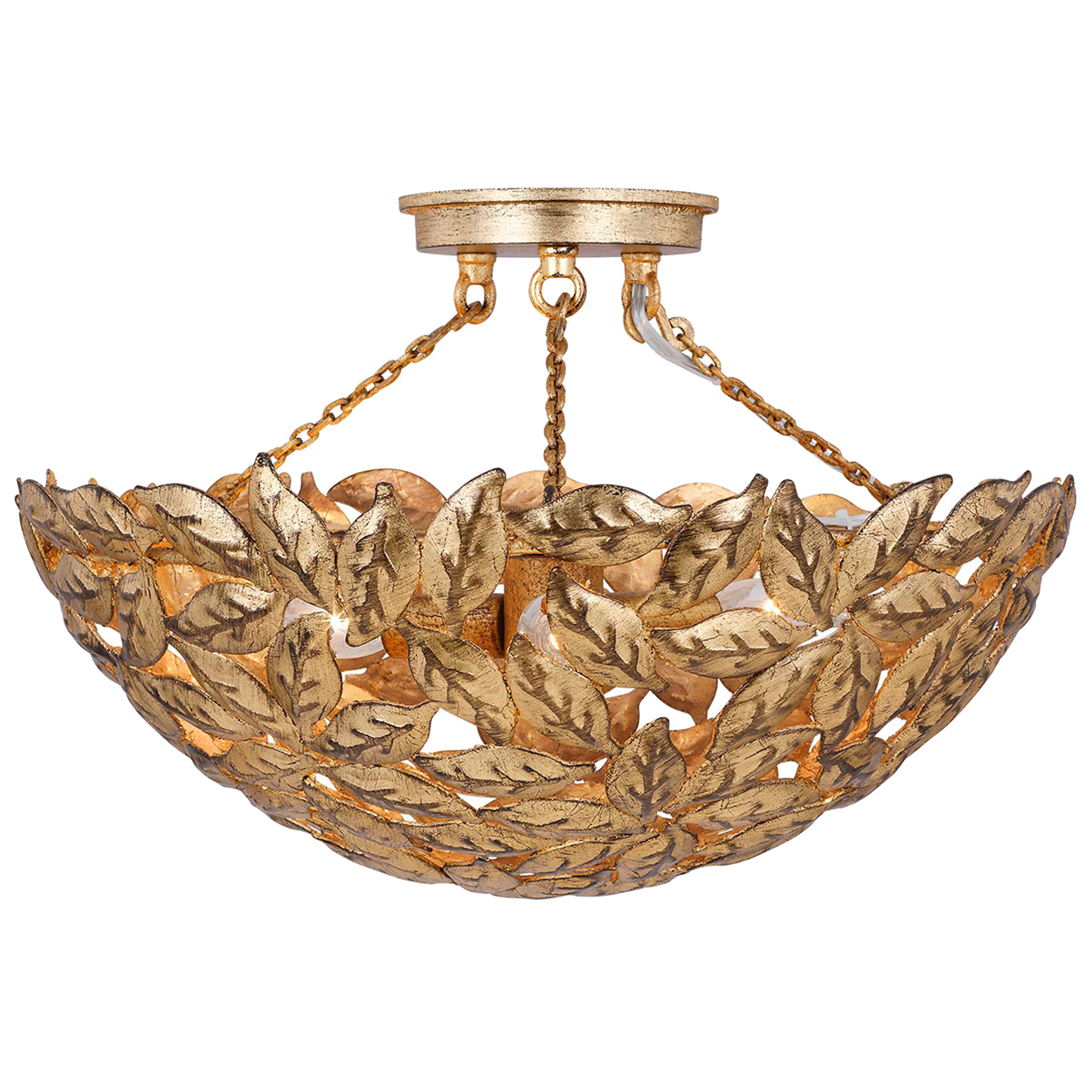 Featuring Kelan Semi Flush Mount Antique Gild by Visual Comfort at Amethyst Home. The elegant forms of motif leaves give this radiant chandelier a vintage-inspired aesthetic that can instantly elevate any interior with classic appeal.